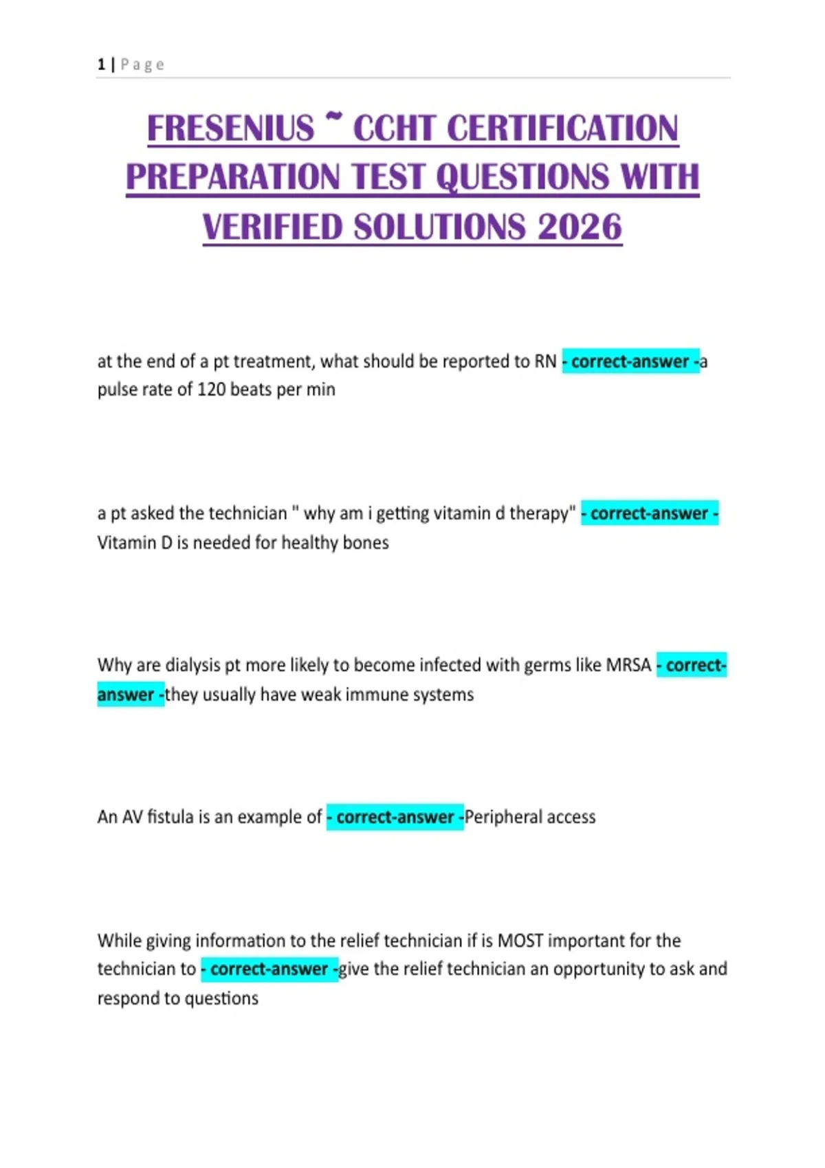 FRESENIUS ~ CCHT CERTIFICATION PREPARATION TEST QUESTIONS WITH VERIFIED SOLUTIONS 2026
