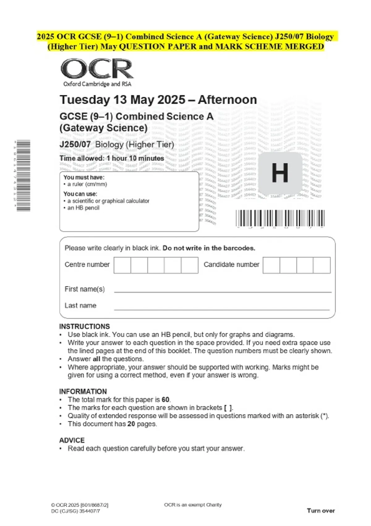 2025 OCR GCSE (9–1) Combined Science A (Gateway Science) J250/07 Biology (Higher Tier) May QUESTION PAPER and MARK SCHEME MERGED
