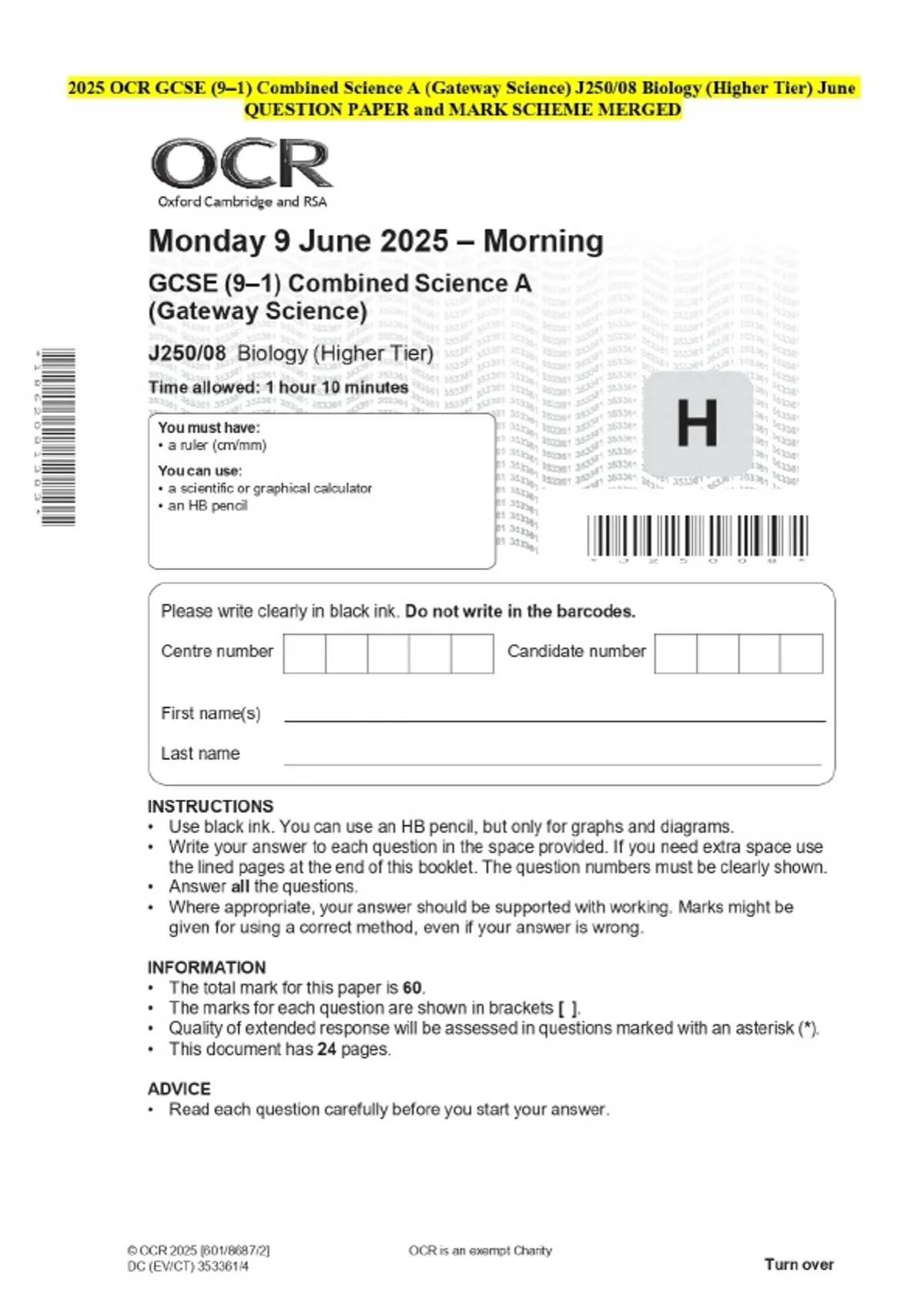 2025 OCR GCSE (9–1) Combined Science A (Gateway Science) J250/08 Biology (Higher Tier) June QUESTION PAPER and MARK SCHEME MERGED
