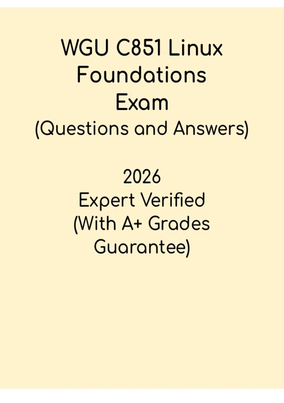 This WGU C851 Linux Foundations Exam Study Guide PDF is a comprehensive and beginner-friendly resource designed to help Western Governors University students prepare effectively for the Linux Foundations course, covering essential topics such as Linux operating system fundamentals, command-line usage, file systems, permissions, processes, networking basics, security, and open-source concepts, with clear explanations, structured summaries, and exam-focused insights to support efficient revision and successful course completion.