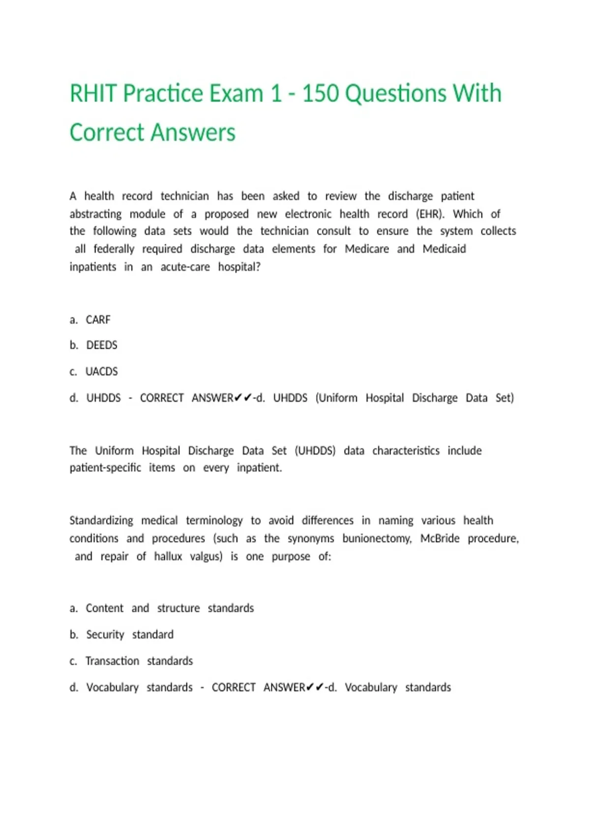RHIT Practice Exam 1 - 150 Questions With Correct Answers