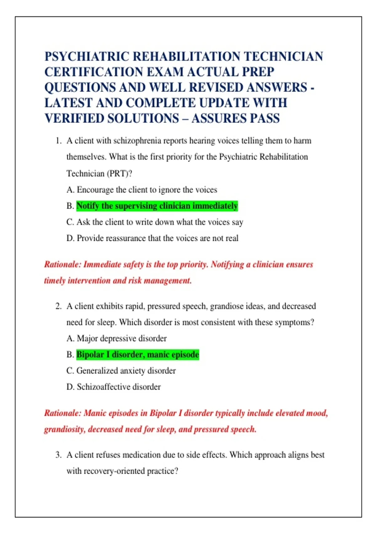 PSYCHIATRIC REHABILITATION TECHNICIAN CERTIFICATION EXAM ACTUAL PREP QUESTIONS AND WELL REVISED ANSWERS - LATEST AND COMPLETE UPDATE WITH VERIFIED SOLUTIONS – ASSURES PASS