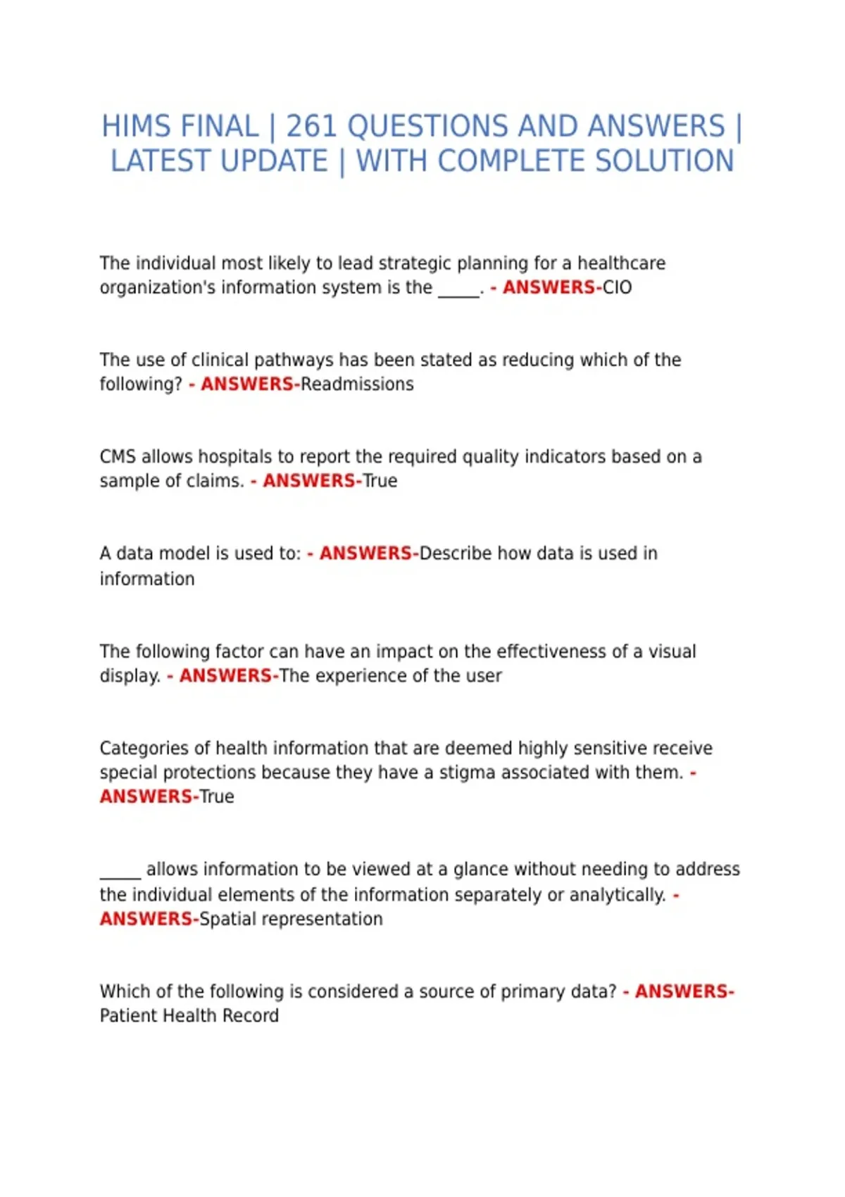 HIMS FINAL | 261 QUESTIONS AND ANSWERS |