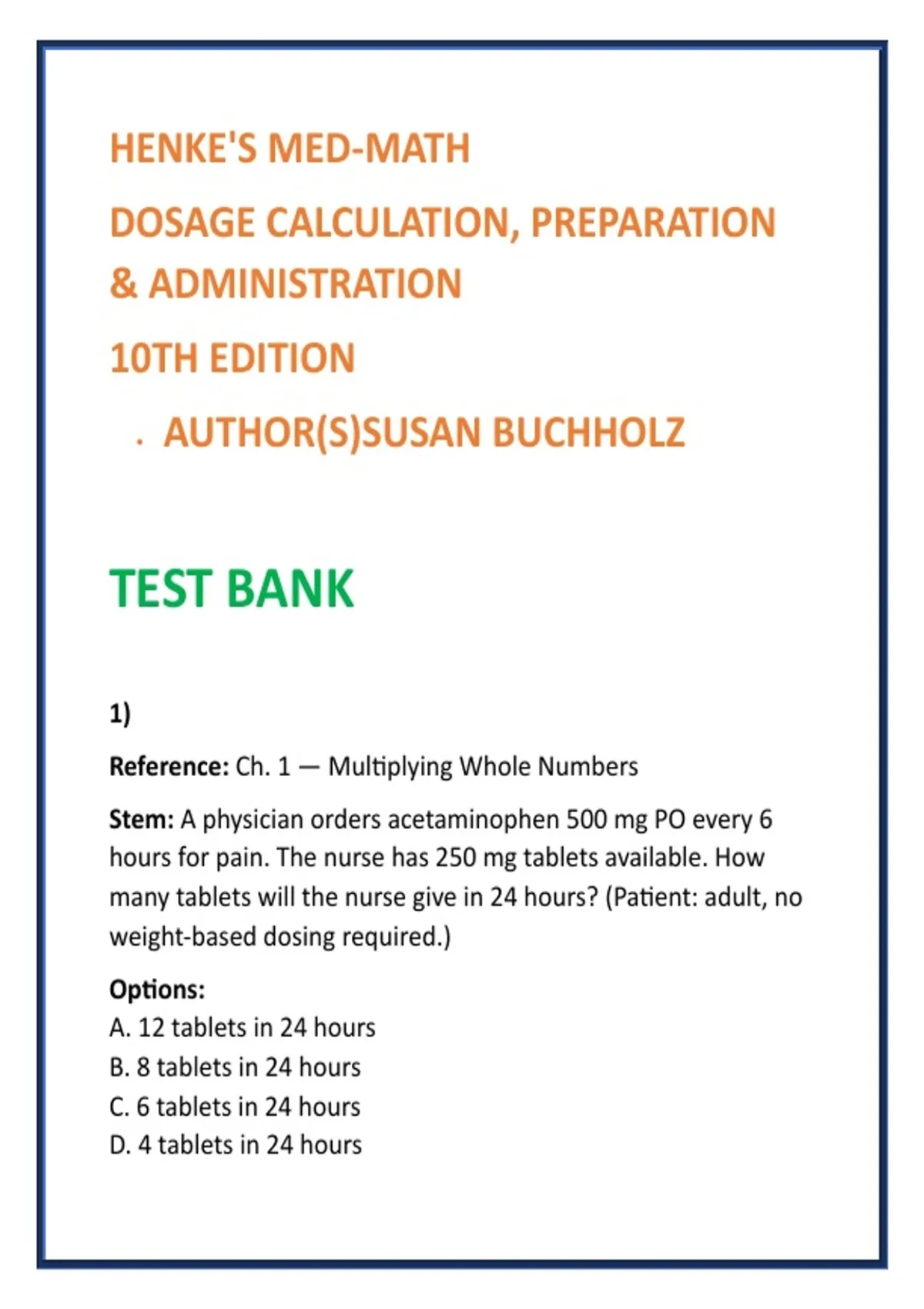 Henke’s Med-Math Test Bank | Dosage Calculation Nursing MCQs | Buchholz Review | Nursing Test Bank 2026 | Nursing Test Bank 2) SEO Product Description (200–300 words) Master nursing dosage calculations and medication administration with this comprehensive digital test bank aligned to Henke’s Med-Math: Dosage Calculation, Preparation & Administration, 10th Edition by Susan Buchholz—the gold-standard textbook for nursing medication math education. This professionally developed nursing test bank provides FULL chapter-by-chapter coverage, featuring 20 calculation-focused MCQs per chapter, each paired with accurate answers and clear, step-by-step rationales. Every question is designed to mirror real clinical decision-making, reinforcing precision, safety, and confidence in medication preparation and administration. Built for students who must achieve error-free dosage accuracy, this resource emphasizes dimensional analysis, ratio-proportion, weight-based dosing, pediatric calculations, and IV medication math, ensuring readiness for exams, skills check-offs, and clinical practice. What’s Included: Full textbook coverage — all units and chapters 20 nursing dosage-calculation MCQs per chapter Detailed step-by-step rationales for every calculation Oral, parenteral, IV, pediatric, and weight-based dosing scenarios Strong focus on medication safety and clinical accuracy Ideal For: Dosage Calculation & Medication Math courses Medication Administration coursework Practical Nursing (PN/LPN) programs Associate Degree Nursing (ADN) programs Pre-clinical nursing skills & foundations math modules Skills check-offs and competency validation This Buchholz Med-Math review test bank saves study time, reduces calculation errors, strengthens critical thinking, and builds the confidence required for safe, accurate medication administration in real clinical settings. 3) 8 High-Value SEO Keywords Henke’s Med-Math test bank nursing dosage calculation MCQs Buchholz med-math review medication administration math study guide nursing medication calculation test bank dosage calculation nursing exam questions nursing medication math practice questions LPN ADN dosage calculation test bank 4) 10 Hashtags #HenkeMedMath #NursingDosageCalculation #MedicationAdministrationMath #NursingTestBank2026 #MedicationSafetyNursing #NursingMathMCQs #LPNADNNursing #ClinicalSkillsNursing #NursingEducationResources #DosageCalculationPractice