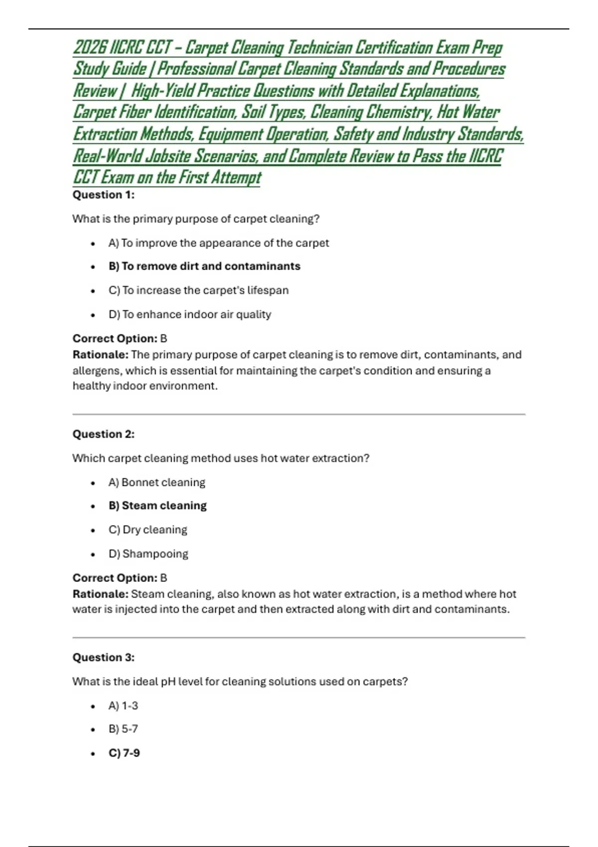 2026 IICRC CCT – Carpet Cleaning Technician Certification Exam Prep Study Guide | Professional Carpet Cleaning Standards and Procedures Review | High-Yield Practice Questions with Detailed Explanations, Carpet Fiber Identification, Soil Types, Cleaning C