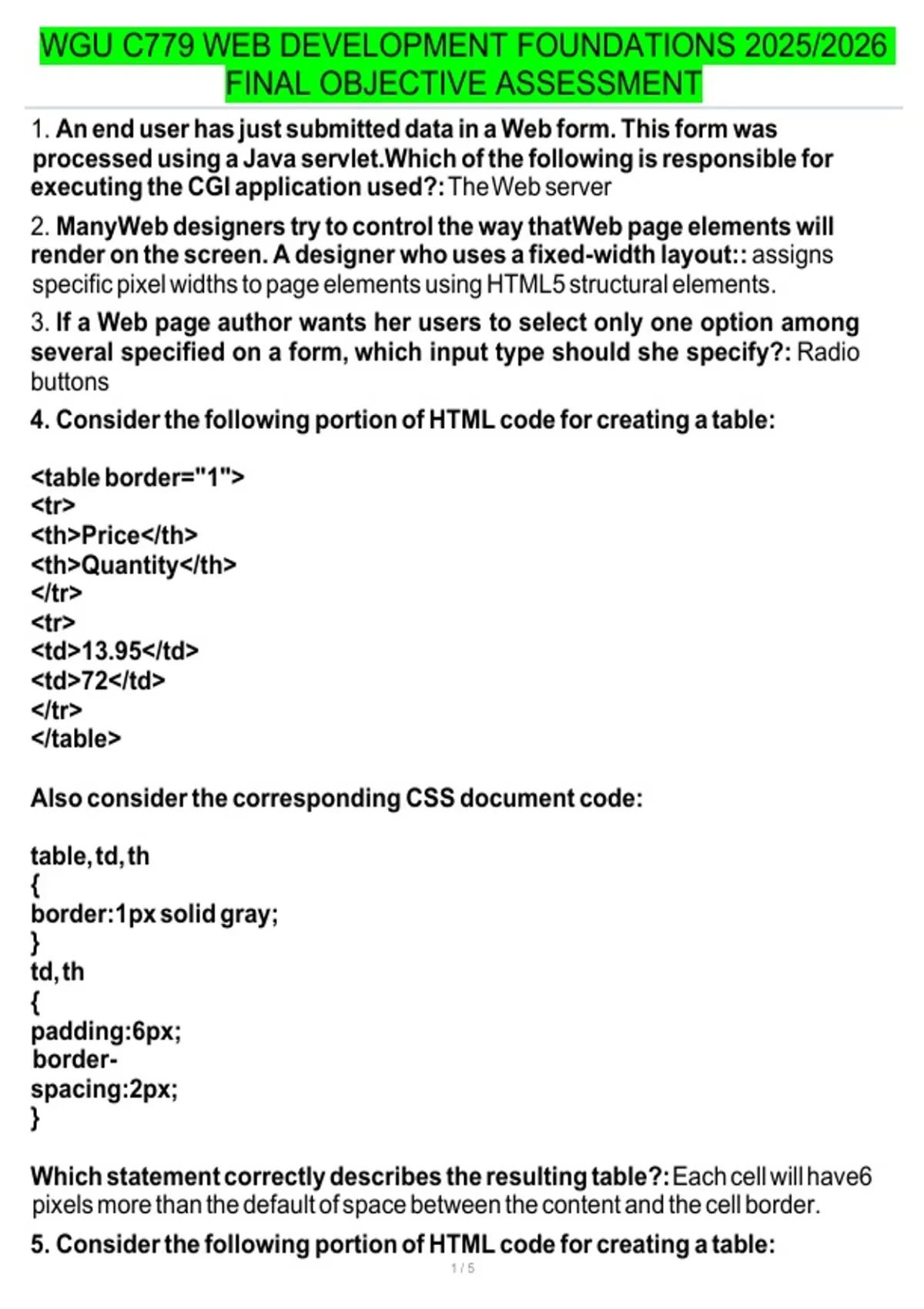 This document provides comprehensive questions and answers for the WGU C779 Web Development course. It covers essential web development concepts including HTML, CSS, JavaScript, responsive design, web standards, accessibility, client-side scripting, and basic web application principles. The material is designed to support effective exam preparation and concept review aligned with the WGU C779 assessment.