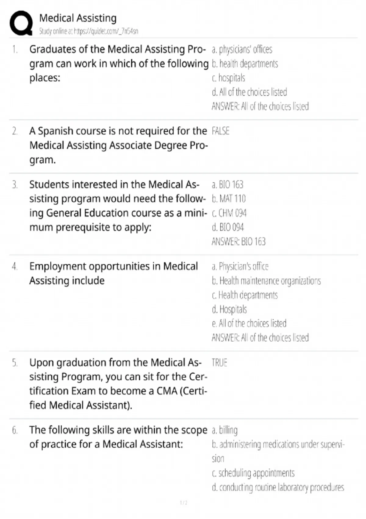Master every aspect of your Medical Assisting program with this all-in-one 2025 study guide and test bank. This resource covers critical topics for clinical skills (phlebotomy, injections, EKG), administrative duties (insurance coding, scheduling, EHR), anatomy, pharmacology, and medical law. Designed for CMA/RMA exam prep and course success, it includes detailed guides, practice questions, and skill checklists to ensure you are fully prepared for certification exams, clinicals, and your future career.