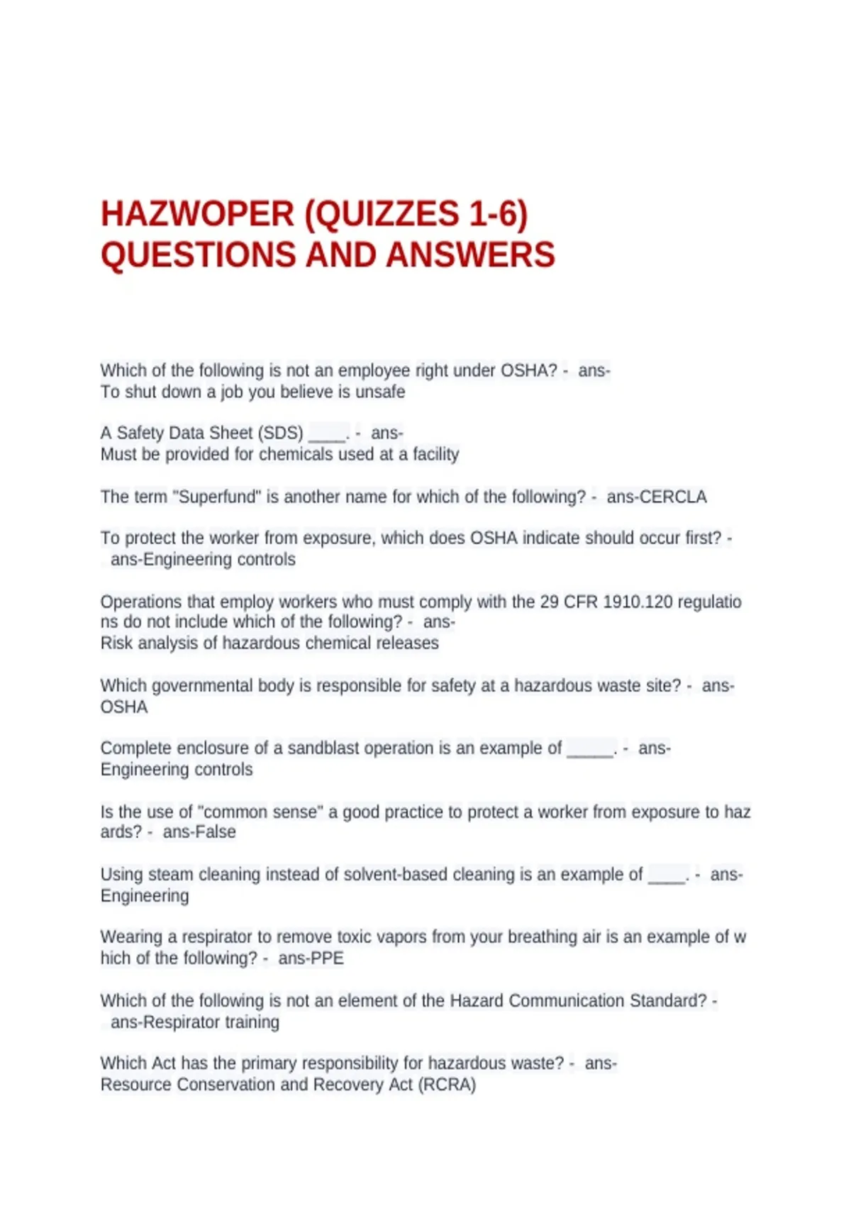 HAZWOPER (QUIZZES 1-6) QUESTIONS AND ANSWERS