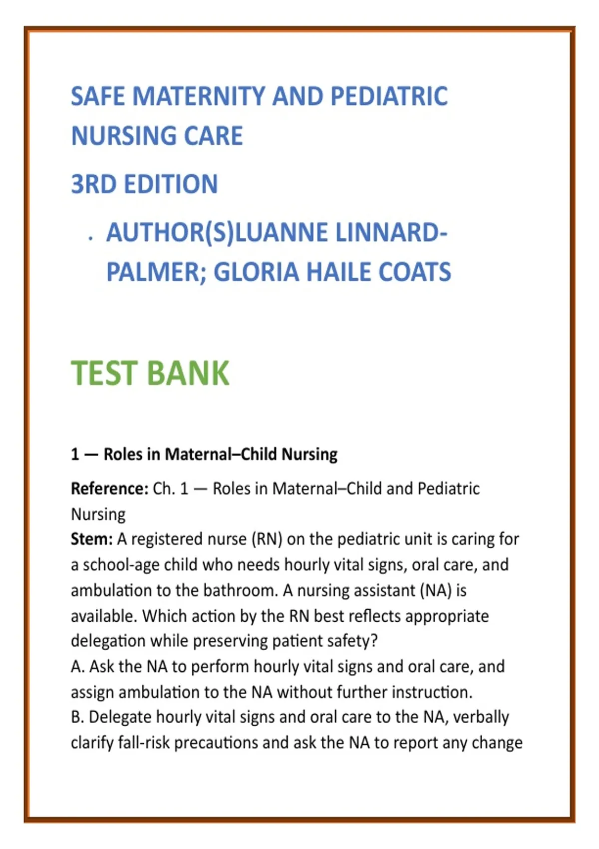 Safe Maternity & Pediatric Nursing Test Bank 2026 | Linnard-Palmer Coats Nursing Test Bank | Maternal-Child NCLEX MCQs 2) SEO Product Description (200–300 words) Master maternity and pediatric nursing with confidence using this Safe Maternity and Pediatric Nursing Care, 3rd Edition Test Bank by Luanne Linnard-Palmer and Gloria Haile Coats—a comprehensive, exam-focused resource built for today’s nursing students. This nursing test bank 2026 provides full textbook coverage across all units and chapters, delivering 20 NCLEX-style multiple-choice questions per chapter, each paired with clear, evidence-based rationales. Every item is designed to strengthen clinical judgment, reinforce patient safety principles, and prepare learners for both course exams and the NCLEX-RN®. Developed around real-world maternal and pediatric scenarios, this nursing test bank emphasizes risk recognition, prioritization, developmental considerations, and safe nursing interventions. Questions reflect current undergraduate nursing expectations and align with application- and analysis-level cognitive skills required for exam success. What’s Included: Full-chapter coverage of Safe Maternity and Pediatric Nursing Care (3rd Edition) 20 NCLEX-style MCQs per chapter Verified correct answers with detailed rationales Clinical reasoning scenarios for maternity and pediatric care Focus on safety, patient management, and nursing interventions Digital format for fast, efficient study Ideal For: Maternity Nursing courses Pediatric Nursing courses Maternal-Child Health Nursing programs NCLEX-RN preparation with a maternity and pediatric focus Whether you are reinforcing coursework, preparing for high-stakes exams, or building clinical confidence, this Linnard-Palmer Coats nursing study guide delivers targeted, high-yield practice trusted by nursing students worldwide. 3) High-Value SEO Keywords (8) Safe Maternity and Pediatric Nursing test bank nursing test bank 2026 maternity nursing test bank pediatric nursing MCQs maternal-child NCLEX questions Linnard-Palmer Coats nursing study guide maternity and pediatric NCLEX review undergraduate nursing test bank 4) Optimized Hashtags (10) #MaternityNursing #PediatricNursing #MaternalChildNursing #NursingTestBank #NCLEXPrep #NursingStudents #NursingExamPrep #ClinicalJudgment #NursingSchoolSuccess #NursingStudyGuide