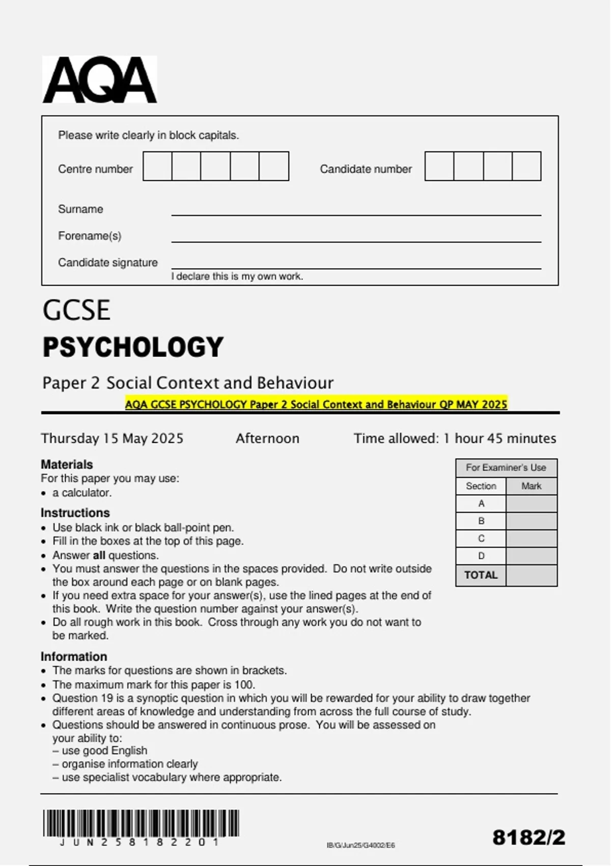 AQA GCSE PSYCHOLOGY Paper 2 Social Context and Behaviour QP MAY 2025