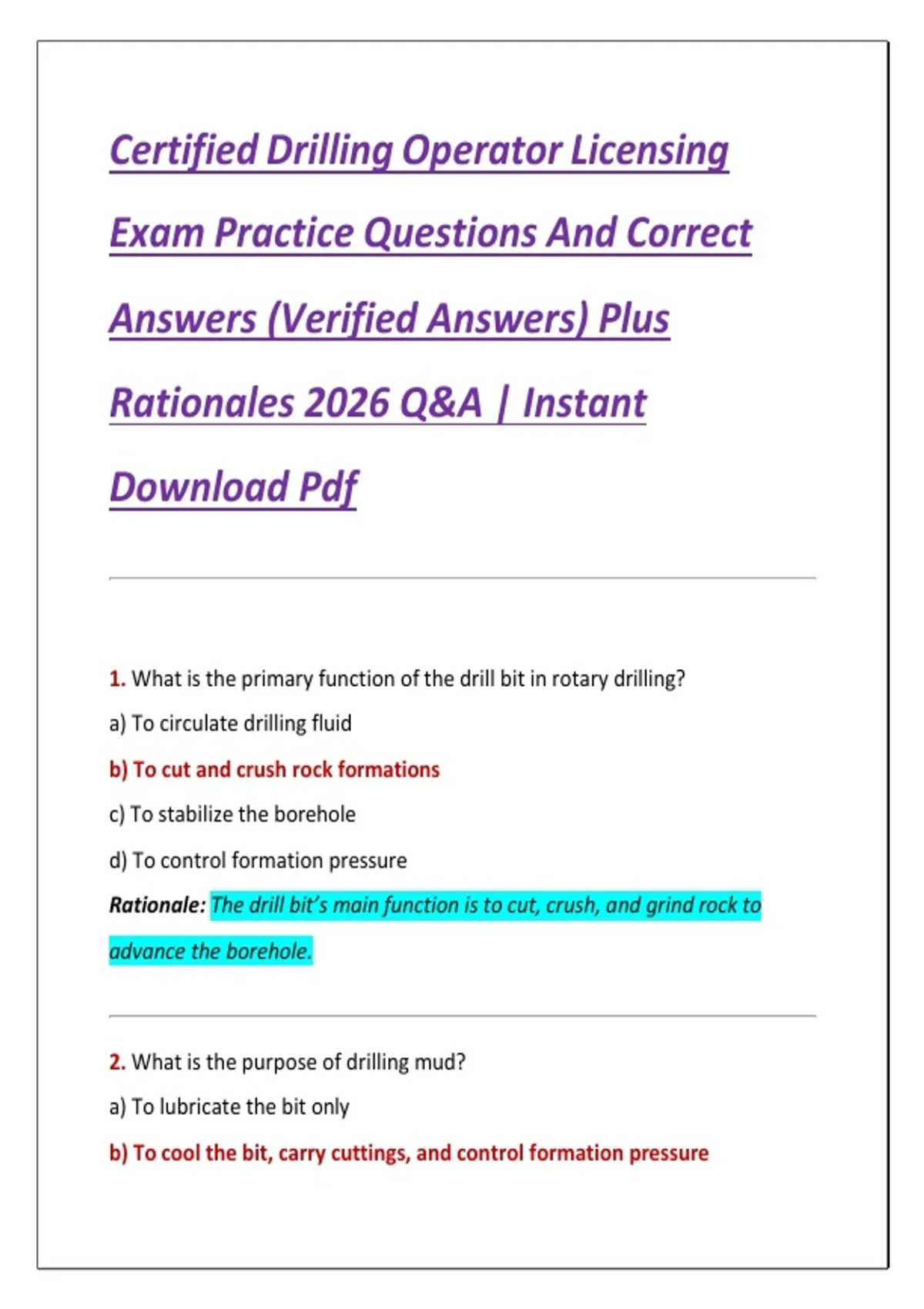 Certified Drilling Operator Licensing Exam Practice Questions And Correct Answers (Verified Answers) Plus Rationales 2026 Q&A | Instant Download Pdf