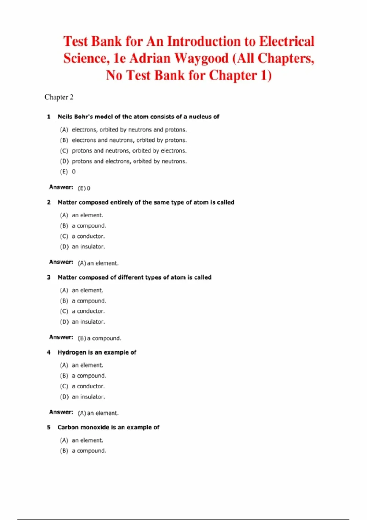 An Introduction to Electrical Science, 1st Edition – Adrian Waygood – Test Bank (All Chapters Covered 2–23). This test bank provides comprehensive assessment material for the 1st edition, meticulously covering the curriculum from the fundamental "Electron Theory" through to advanced three-phase systems. The material begins with Chapter 2: The "Electron Theory" of Electricity and Chapter 3: Electric Current. Core circuit principles and components are evaluated in Chapter 4: Potential and Potential Difference, Chapter 5: Resistance, Chapter 6: Practical Conductors and Insulators, and Chapter 7: Effect of Temperature Change upon Resistance. Practical application is assessed through Chapter 8: Ohm's Law, Chapter 9: Series, Parallel and Series-Parallel Circuits, Chapter 10: Cells and Batteries, and Chapter 11: Internal Resistance of Voltage Sources. The bank explores energy and magnetism in Chapter 12: Energy, Work, Heat and Power, Chapter 13: Magnetism, Chapter 14: Electromagnetism, Chapter 15: Magnetic Circuits, and Chapter 16: Electromagnetic Induction. The final sections evaluate complex AC theory, including Chapter 17: Capacitors and Capacitance, Chapter 18: Introduction to Alternating Current, Chapters 19-21: Series and Parallel AC Circuits, Chapter 22: Power Factor Improvement, and Chapter 23: Balanced Three-Phase A.C. Systems.