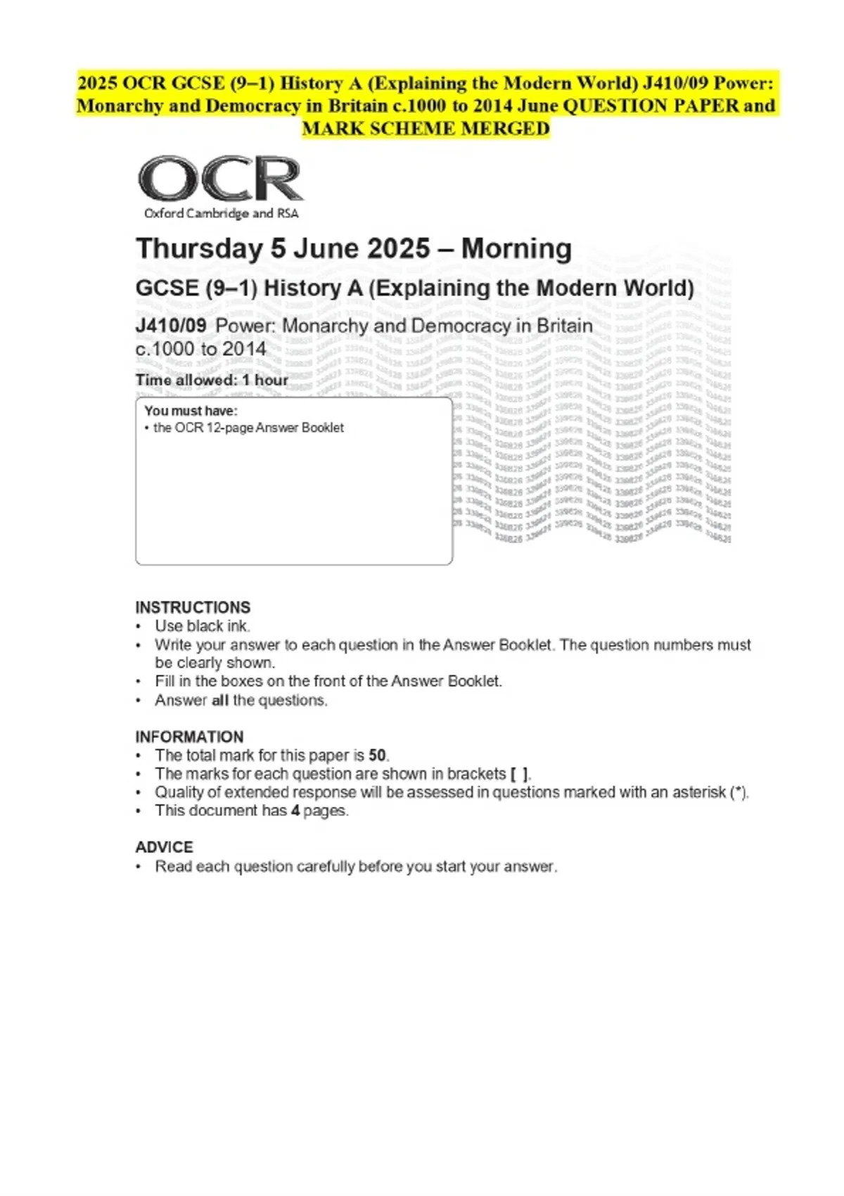 2025 OCR GCSE (9–1) History A (Explaining the Modern World) J410/09 Power: Monarchy and Democracy in Britain c.1000 to 2014 June QUESTION PAPER and MARK SCHEME MERGED