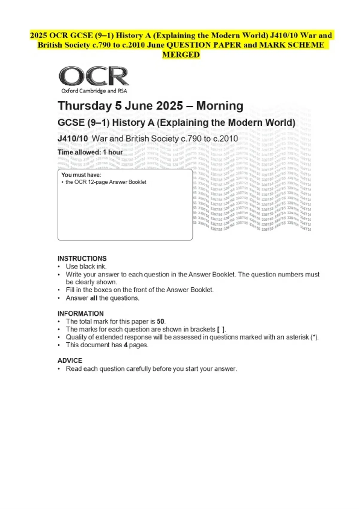 2025 OCR GCSE (9–1) History A (Explaining the Modern World) J410/10 War and British Society c.790 to c.2010 June QUESTION PAPER and MARK SCHEME MERGED