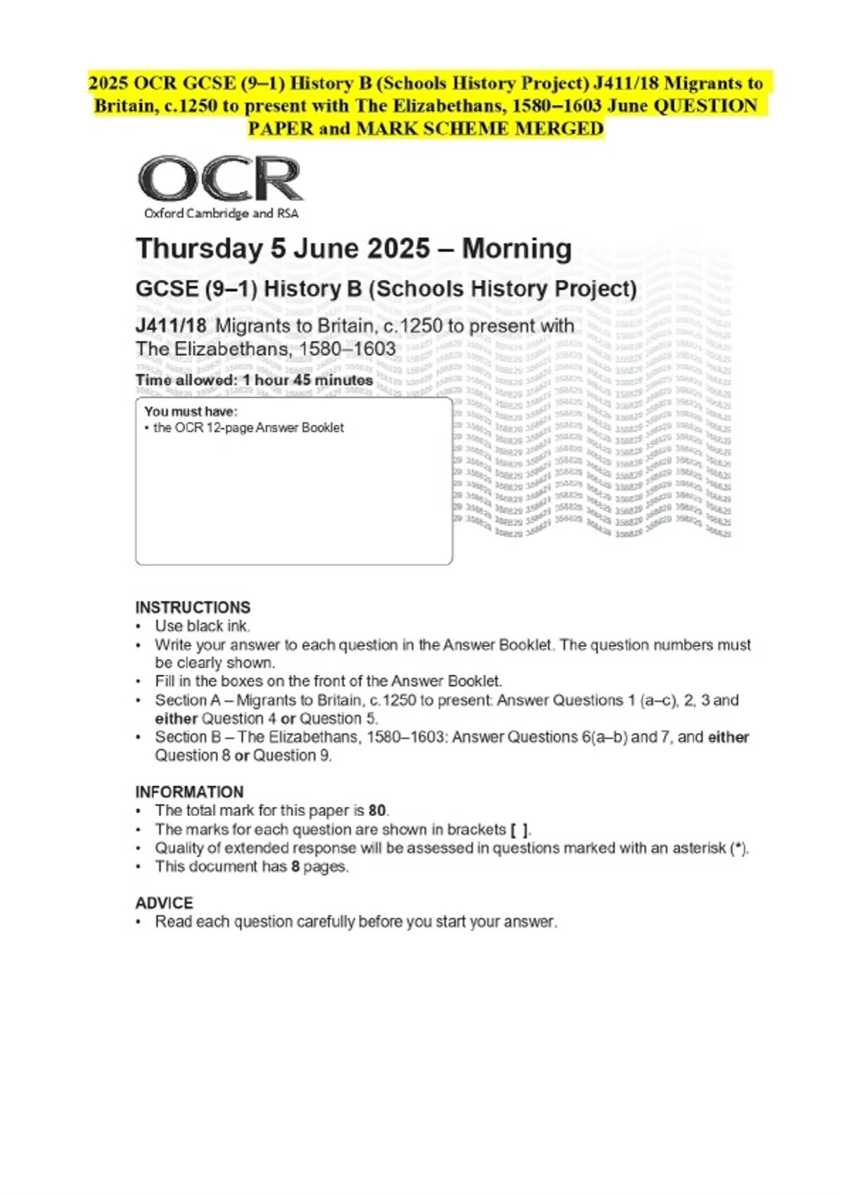 2025 OCR GCSE (9–1) History B (Schools History Project) J411/18 Migrants to Britain, c.1250 to present with The Elizabethans, 1580–1603 June QUESTION PAPER and MARK SCHEME MERGED