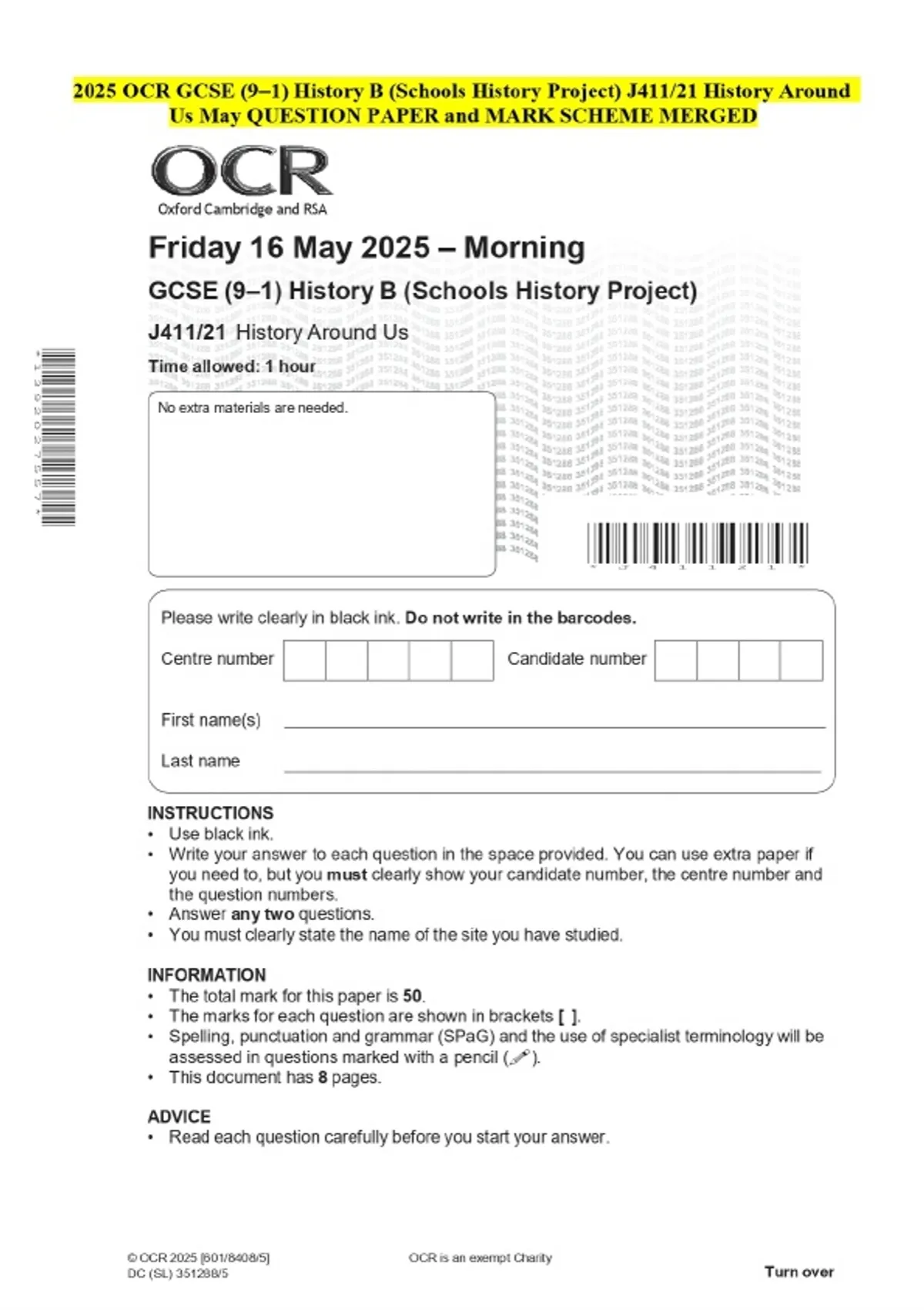 2025 OCR GCSE (9–1) History B (Schools History Project) J411/21 History Around Us May QUESTION PAPER and MARK SCHEME MERGED
