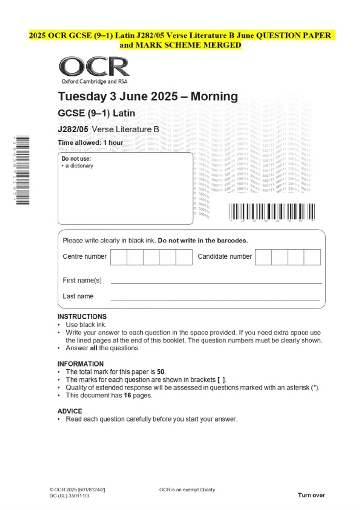 2025 OCR GCSE (9–1) Latin J282/05 Verse Literature B June QUESTION PAPER and MARK SCHEME MERGED