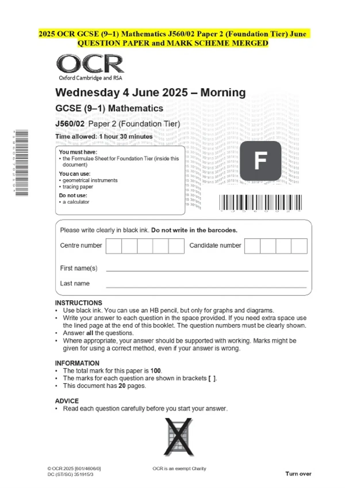 2025 OCR GCSE (9–1) Mathematics J560/02 Paper 2 (Foundation Tier) June QUESTION PAPER and MARK SCHEME MERGED