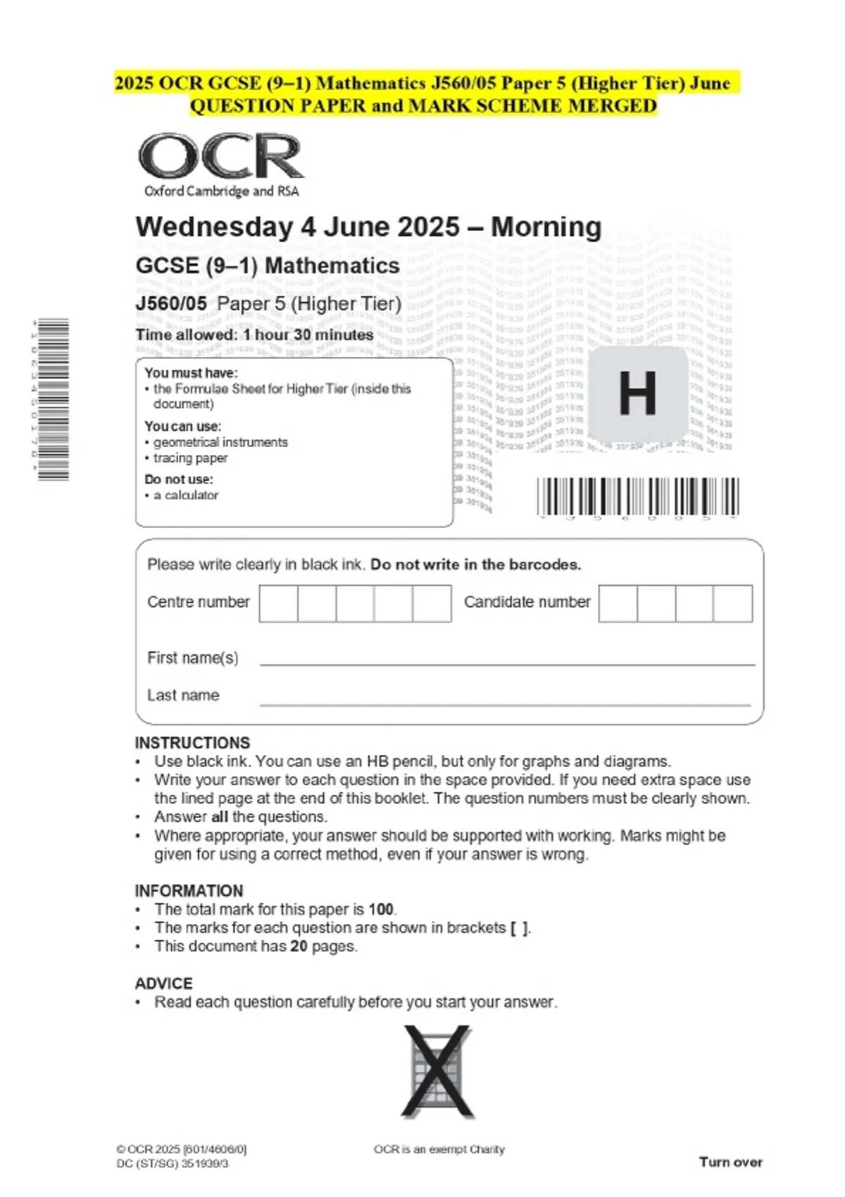 2025 OCR GCSE (9–1) Mathematics J560/05 Paper 5 (Higher Tier) June QUESTION PAPER and MARK SCHEME MERGED