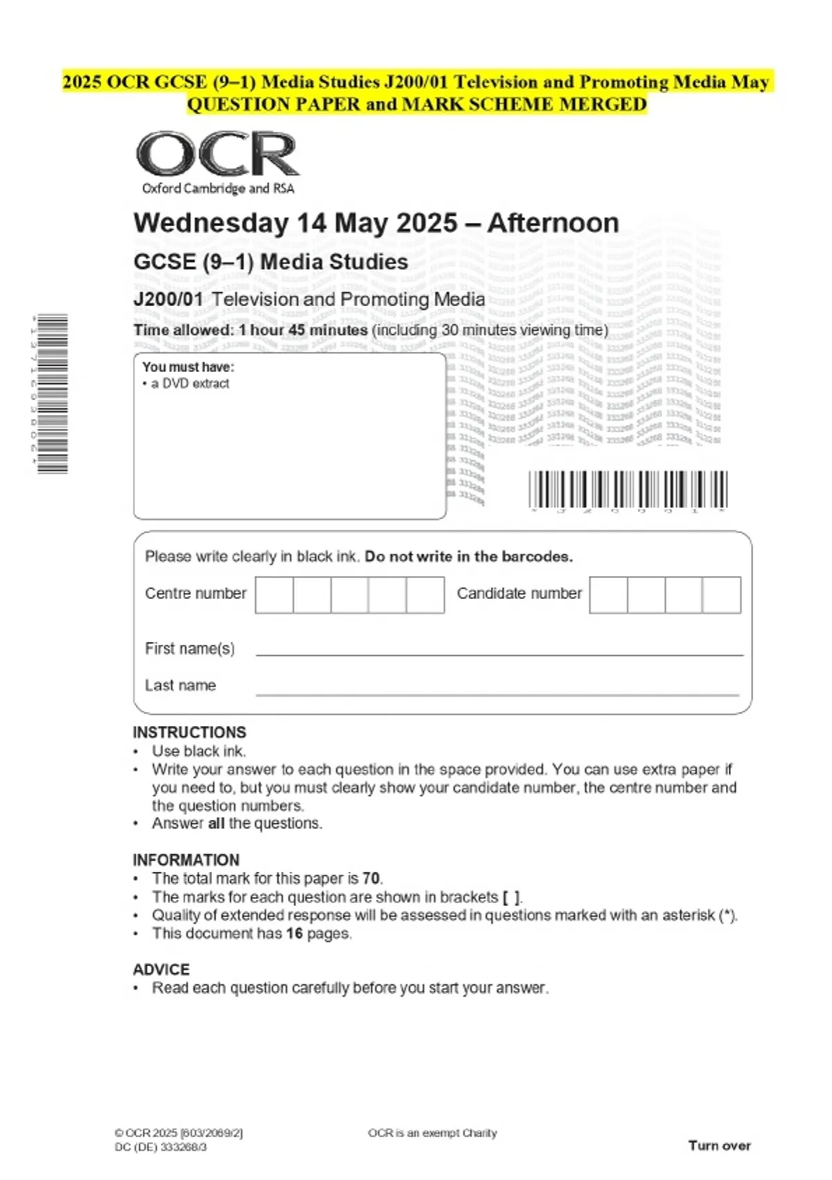 2025 OCR GCSE (9–1) Media Studies J200/01 Television and Promoting Media May QUESTION PAPER and MARK SCHEME MERGED