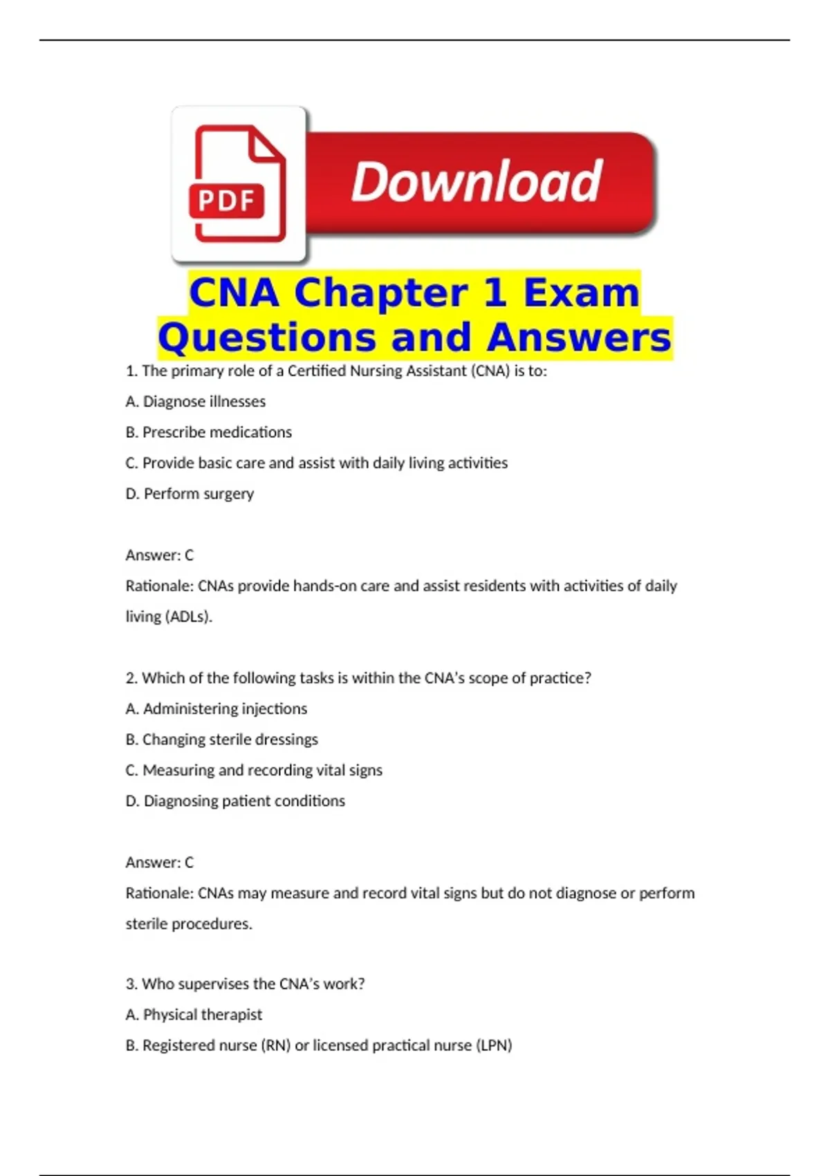 1. The primary role of a Certified Nursing Assistant (CNA) is to: