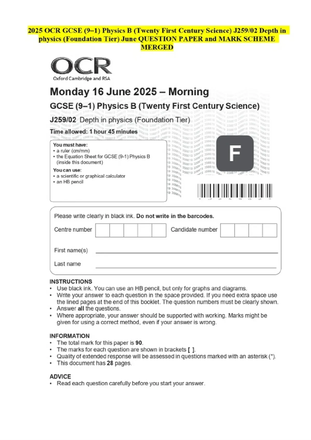 2025 OCR GCSE (9–1) Physics B (Twenty First Century Science) J259/02 Depth in physics (Foundation Tier) June QUESTION PAPER and MARK SCHEME MERGED