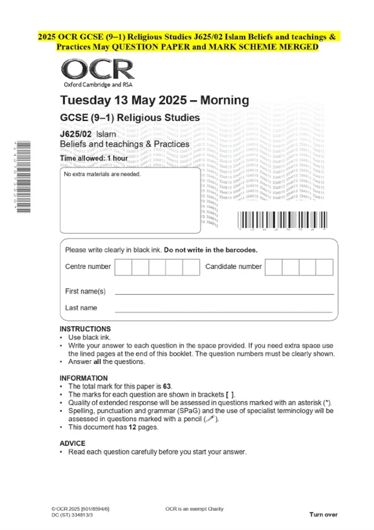 2025 OCR GCSE (9–1) Religious Studies J625/02 Islam Beliefs and teachings & Practices May QUESTION PAPER and MARK SCHEME MERGED