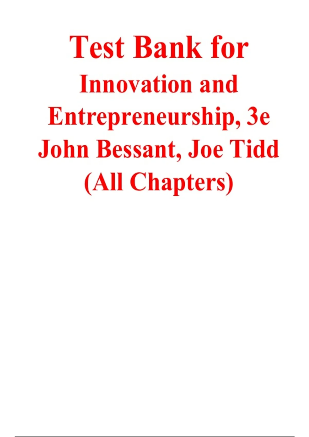 Comprehensive test bank for Innovation and Entrepreneurship 3rd Edition by John Bessant and Joe Tidd. Covers all chapters with practice questions and answers to help students master innovation concepts, entrepreneurship principles, and prepare effectively for exams.