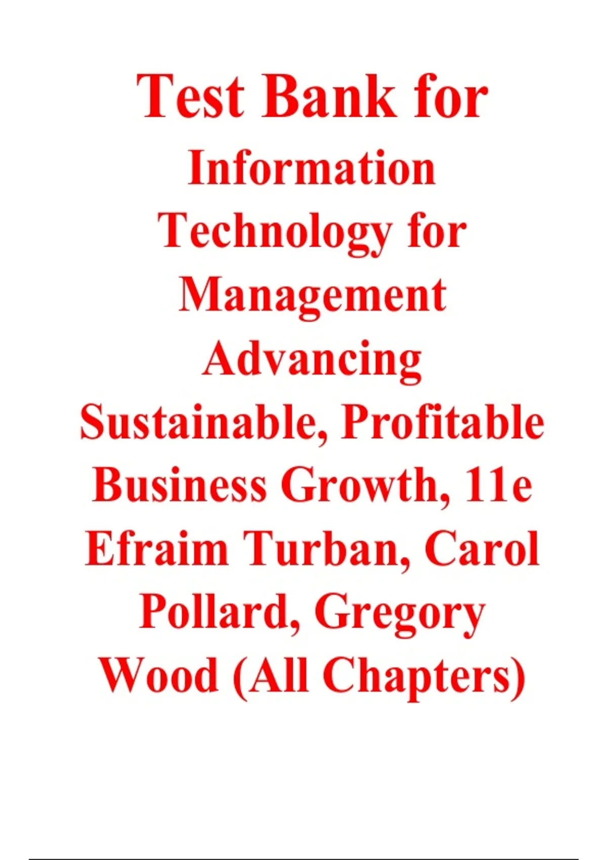 Comprehensive test bank for Information Technology for Management: Advancing Sustainable, Profitable Business Growth 11th Edition. Includes chapter-by-chapter questions and answers to help students understand IT management concepts, support business growth strategies, and prepare effectively for exams.