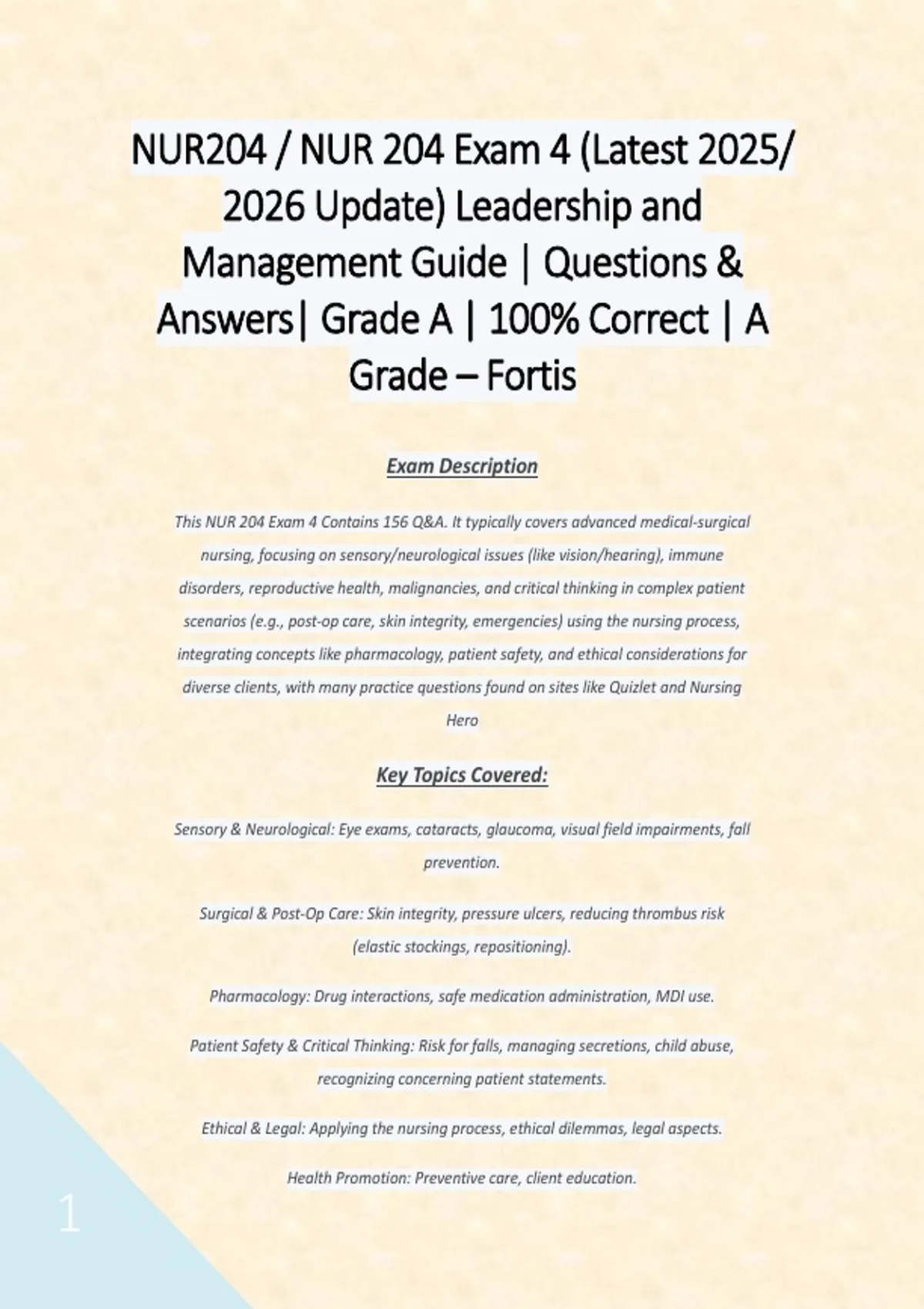 NUR204 / NUR 204 Exam 4 (Latest 2025/ 2026 Update) Leadership and Management Guide | Questions & Answers| Grade A | 100% Correct | A Grade – Fortis Exam Description This NUR 204 Exam 4 Contains 156 Q&A. It typically covers advanced medical-surgical nursing, focusing on sensory/neurological issues (like vision/hearing), immune disorders, reproductive health, malignancies, and critical thinking in complex patient scenarios (e.g., post-op care, skin integrity, emergencies) using the nursing process, integrating concepts like pharmacology, patient safety, and ethical considerations for diverse clients, with many practice questions found on sites like Quizlet and Nursing Hero Key Topics Covered: Sensory & Neurological: Eye exams, cataracts, glaucoma, visual field impairments, fall prevention. Surgical & Post-Op Care: Skin integrity, pressure ulcers, reducing thrombus risk (elastic stockings, repositioning). Pharmacology: Drug interactions, safe medication administration, MDI use. Patient Safety & Critical Thinking: Risk for falls, managing secretions, child abuse, recognizing concerning patient statements. Ethical & Legal: Applying the nursing process, ethical dilemmas, legal aspects. Health Promotion: Preventive care, client education. Common Question Formats: Scenario-based: Applying critical thinking to patient situations (e.g., a nurse noticing a rash). Prioritization: Deciding on the most important nursing intervention (e.g., promoting incentive spirometry). Sequencing: Putting steps of a procedure in order (e.g., MDI use, post-mortem care).