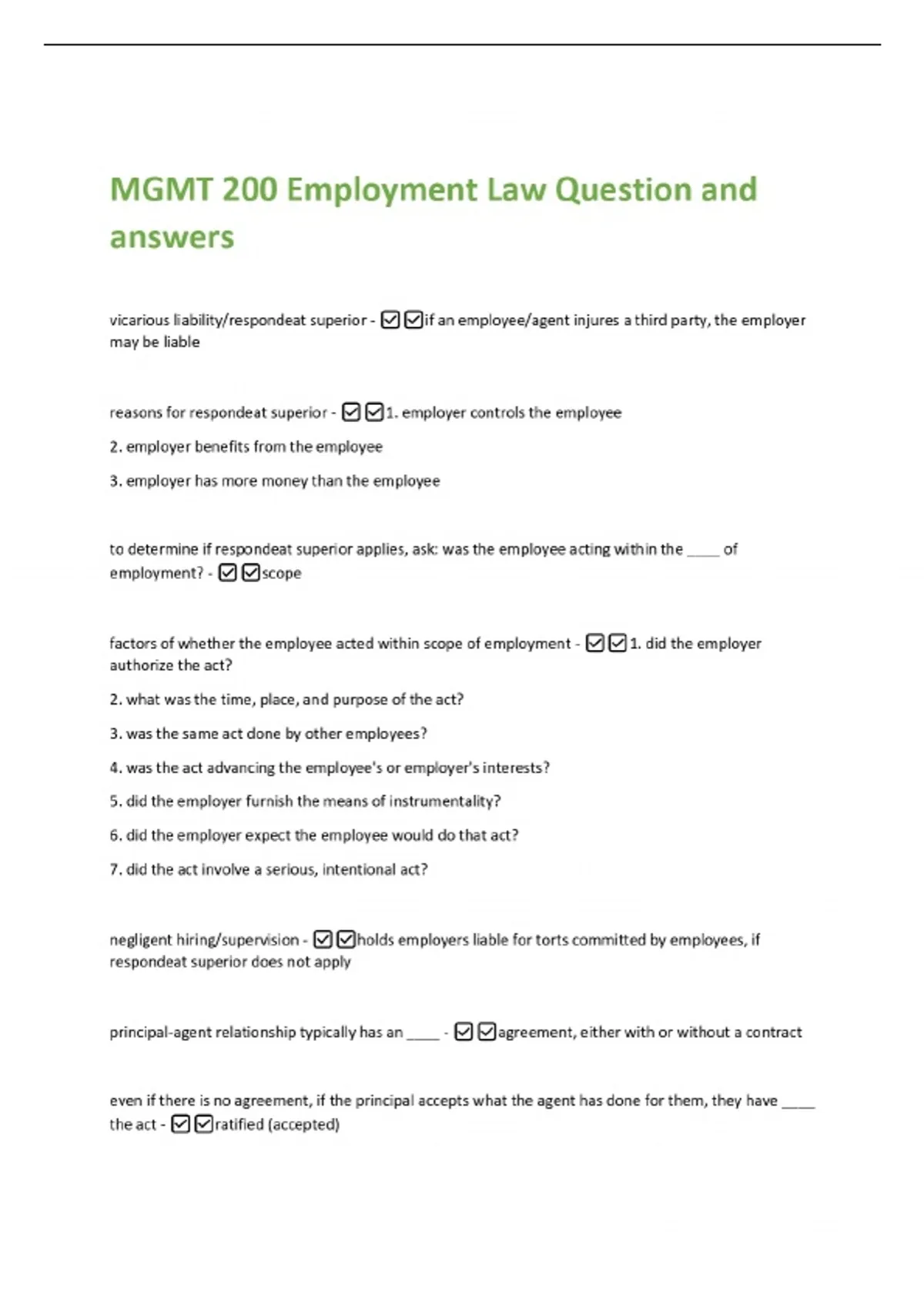MGMT 200 Employment Law Question and answers vicarious liability/respondeat superior - if an employee/agent injures a third party, the employer may be liable reasons for respondeat superior - 1. employer controls the employee 2. employer benefits from the employee 3. employer has more money than the employee to determine if respondeat superior applies, ask: was the employee acting within the ____ of employment? - scope factors of whether the employee acted within scope of employment - 1. did the employer authorize the act?