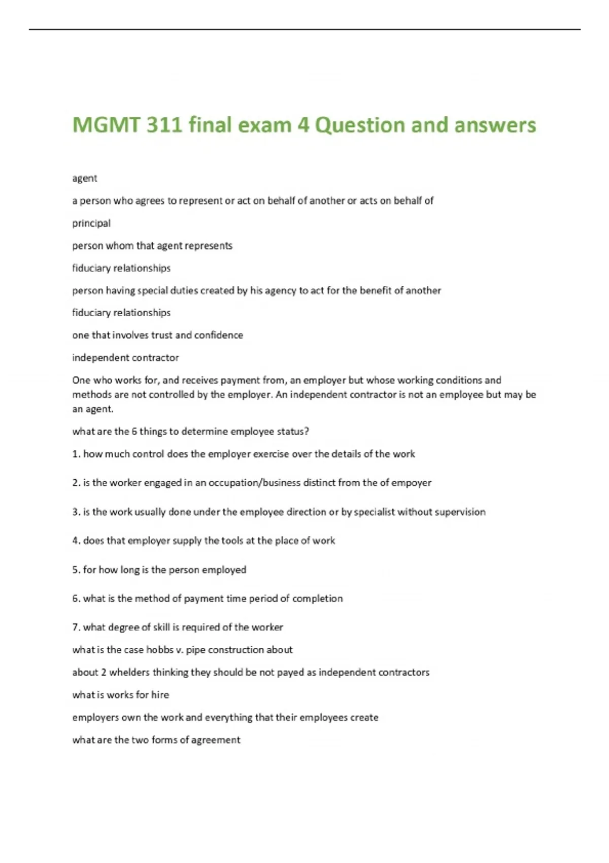 MGMT 311 final exam 4 Question and answers agent a person who agrees to represent or act on behalf of another or acts on behalf of principal person whom that agent represents fiduciary relationships person having special duties created by his agency to act for the benefit of another fiduciary relationships one that involves trust and confidence independent contractor