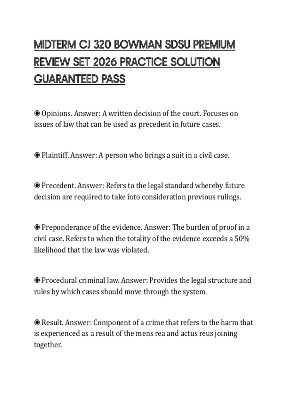 ◉ Precedent. Answer: Refers to the legal standard whereby future