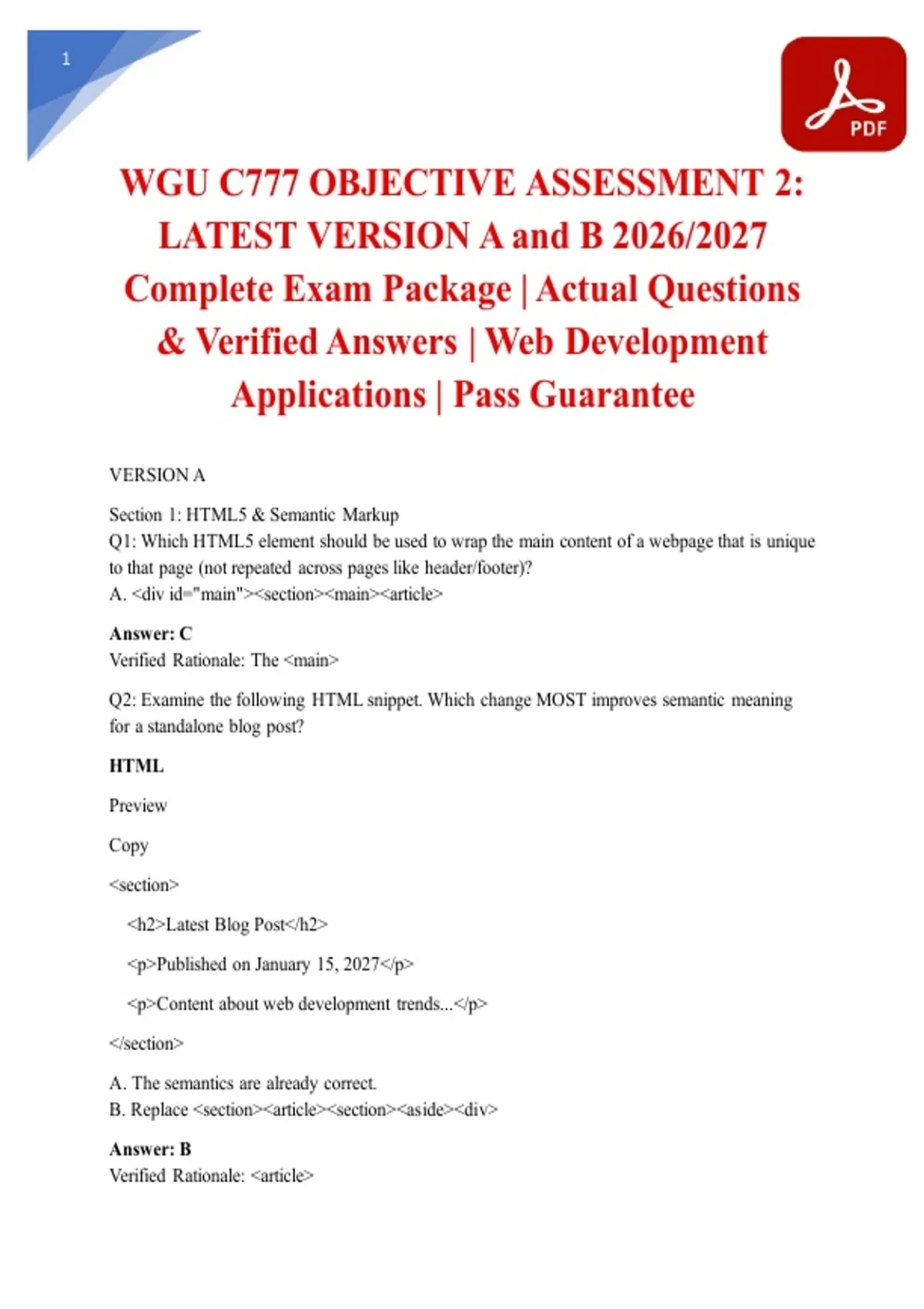 WGU C777 OBJECTIVE ASSESSMENT 2: LATEST VERSION A and B 2026/2027 Complete Exam Package | Actual Questions & Verified Answers | Web Development Applications | Pass Guarantee