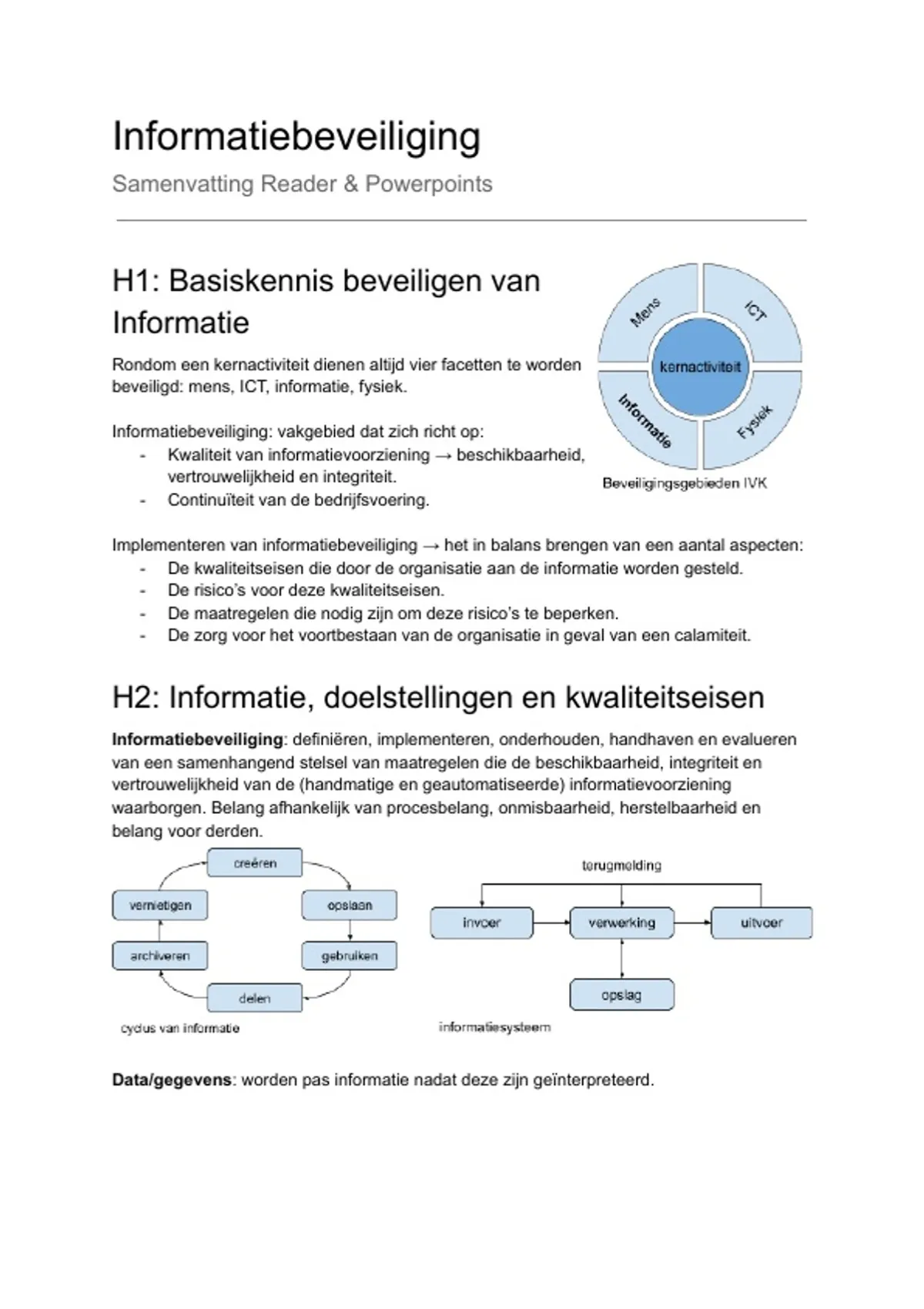 Samenvatting voor het vak (inleiding) informatiebeveiliging voor de opleiding Integrale Veiligheidskunde op hogeschool Inholland Rotterdam. De samenvatting is gebaseerd op een door de docent samengestelde reader en de powerpoints van de docent.