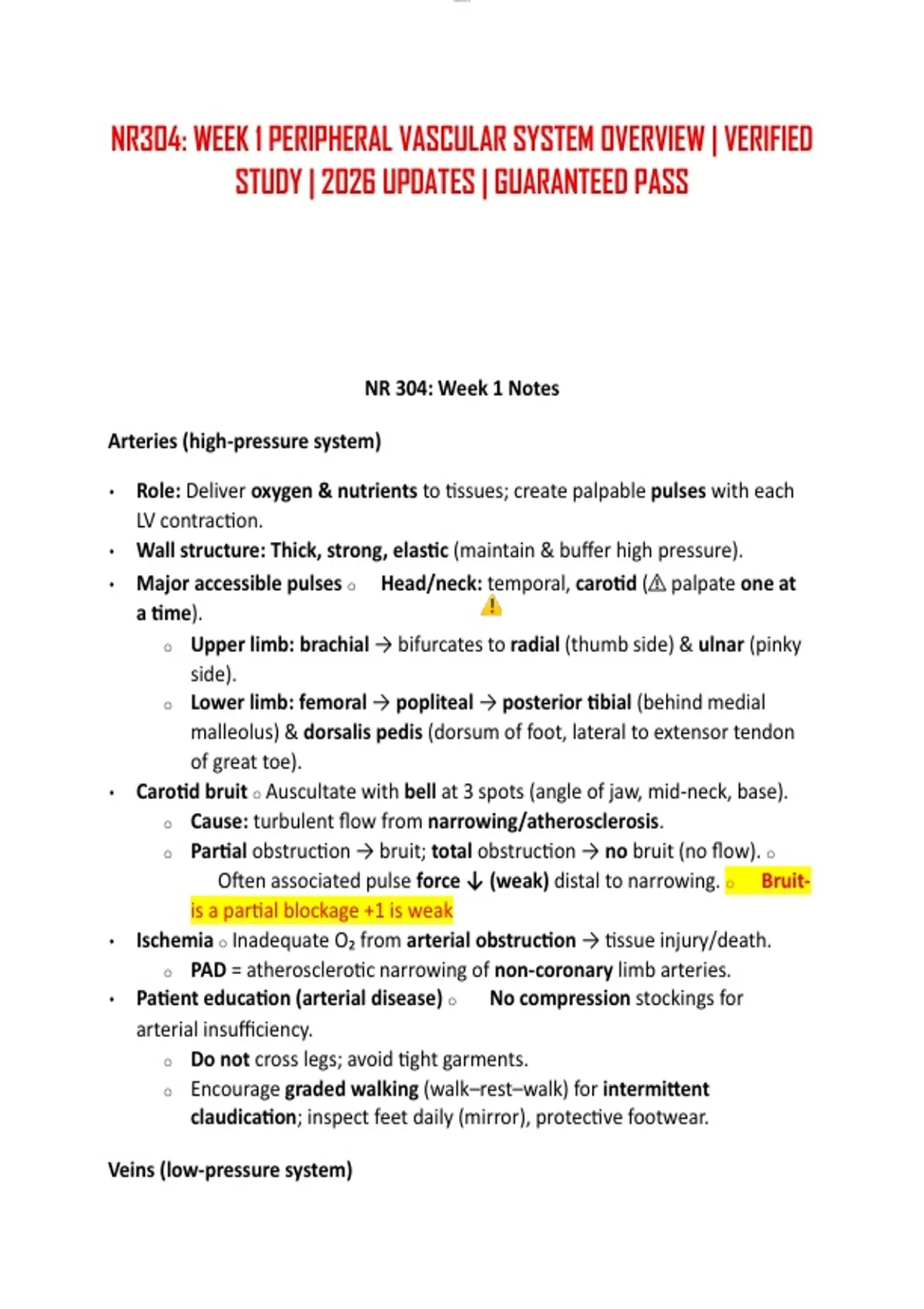 NR304: WEEK 1 PERIPHERAL VASCULAR SYSTEM OVERVIEW | VERIFIED