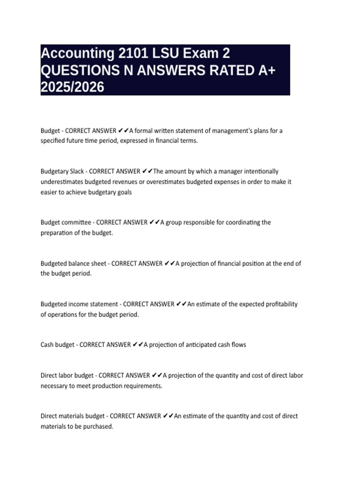 Direct materials budget - CORRECT ANSWER ✔✔An estimate of the quantity and cost of direct