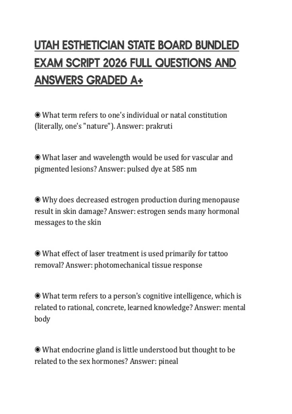 UTAH ESTHETICIAN STATE BOARD BUNDLED EXAM SCRIPT 2026 FULL QUESTIONS AND ANSWERS GRADED A+