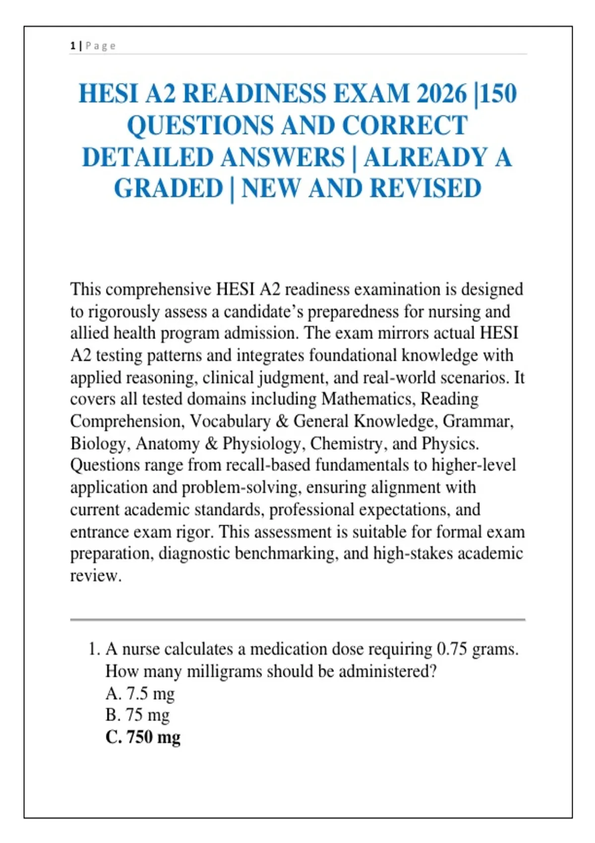 HESI A2 READINESS EXAM 2026 |150 QUESTIONS AND CORRECT DETAILED ANSWERS | ALREADY A GRADED | NEW AND REVISED