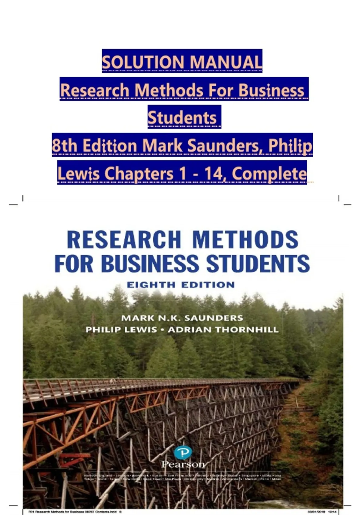 This comprehensive solutions manual supports Research Methods for Business Students, 8th Edition by Mark N. K. Saunders, Philip Lewis, and Adrian Thornhill, the widely used edition for business and management research courses. It provides verified, chapter‑by‑chapter worked solutions covering all core topics from business and management research, choosing a research topic, literature review, research philosophy, research design, sampling, ethical access, secondary data, observation methods, interviews, surveys, quantitative and qualitative data analysis, and writing and presenting your project report. The manual is aligned with the textbook’s structure and learning goals, making it ideal for students preparing for exams, research proposals, dissertation planning, and coursework. Organized for efficient study and review, it helps reinforce understanding of research methods principles and analytical techniques.