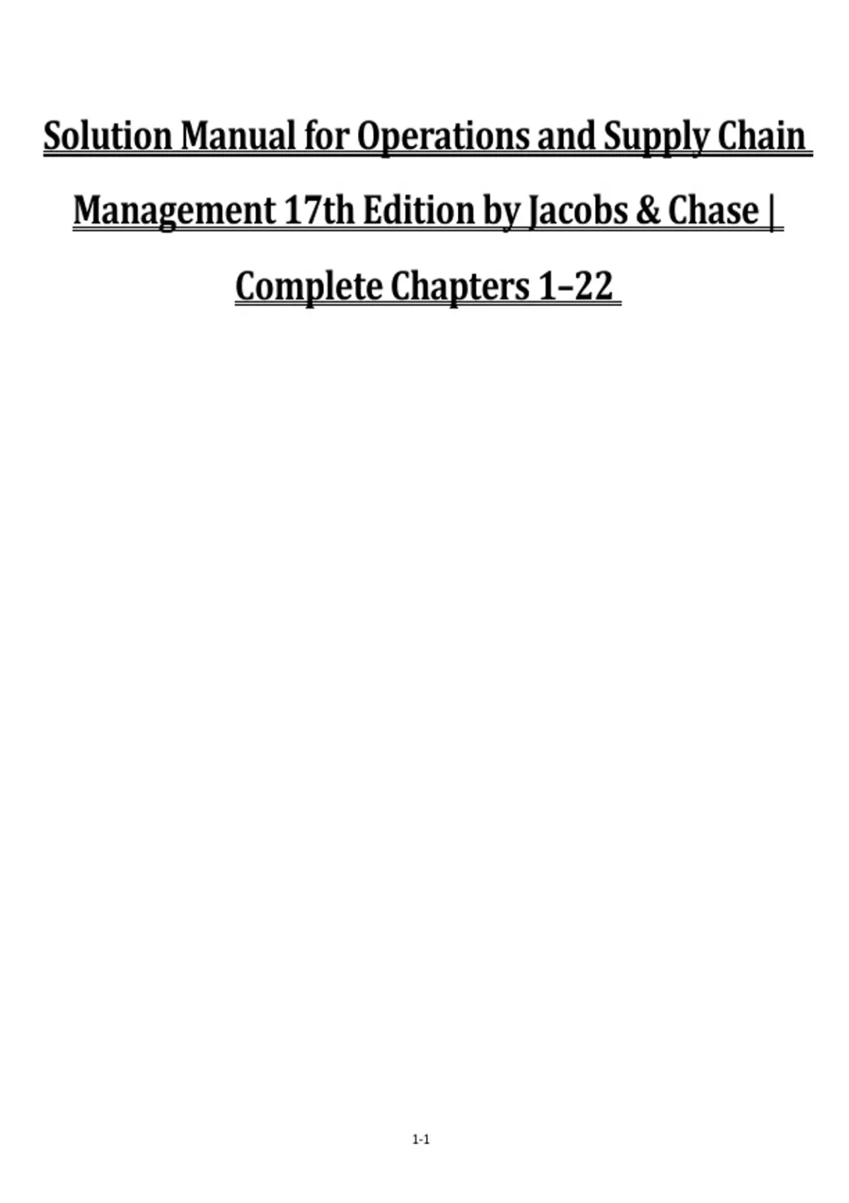 This comprehensive solutions manual accompanies Operations and Supply Chain Management, 17th Edition by F. Robert Jacobs and Richard Chase, covering all Chapters 1 through 22 with fully worked, verified solutions. It supports key topics including operations strategy, product and service design, capacity planning, manufacturing and service processes, facility layout, quality and statistical control, lean supply chains, logistics and distribution, global sourcing, forecasting, sales and operations planning, inventory management, material requirements planning (MRP), and scheduling. Designed for undergraduate and graduate business, supply chain, and operations management students, this manual clarifies problem‑solving steps, reinforces learning objectives, and improves understanding of both foundational and advanced OSCM concepts. Organized by chapter for efficient review, it is ideal for homework, exams, and professional preparation.