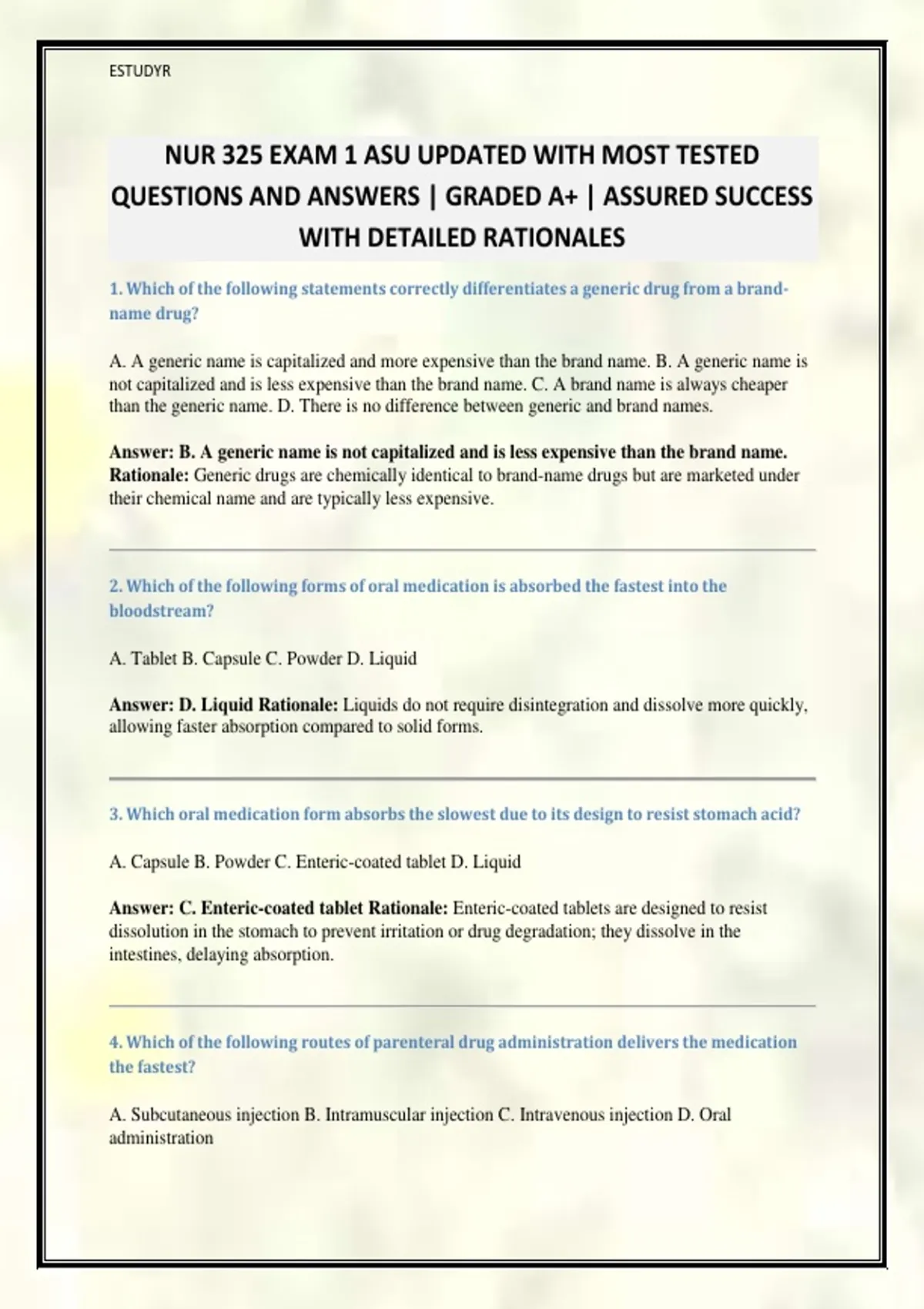 NUR 325 EXAM 1 ASU UPDATED WITH MOST TESTED QUESTIONS AND ANSWERS | GRADED A+ | ASSURED SUCCESS WITH DETAILED RATIONALES