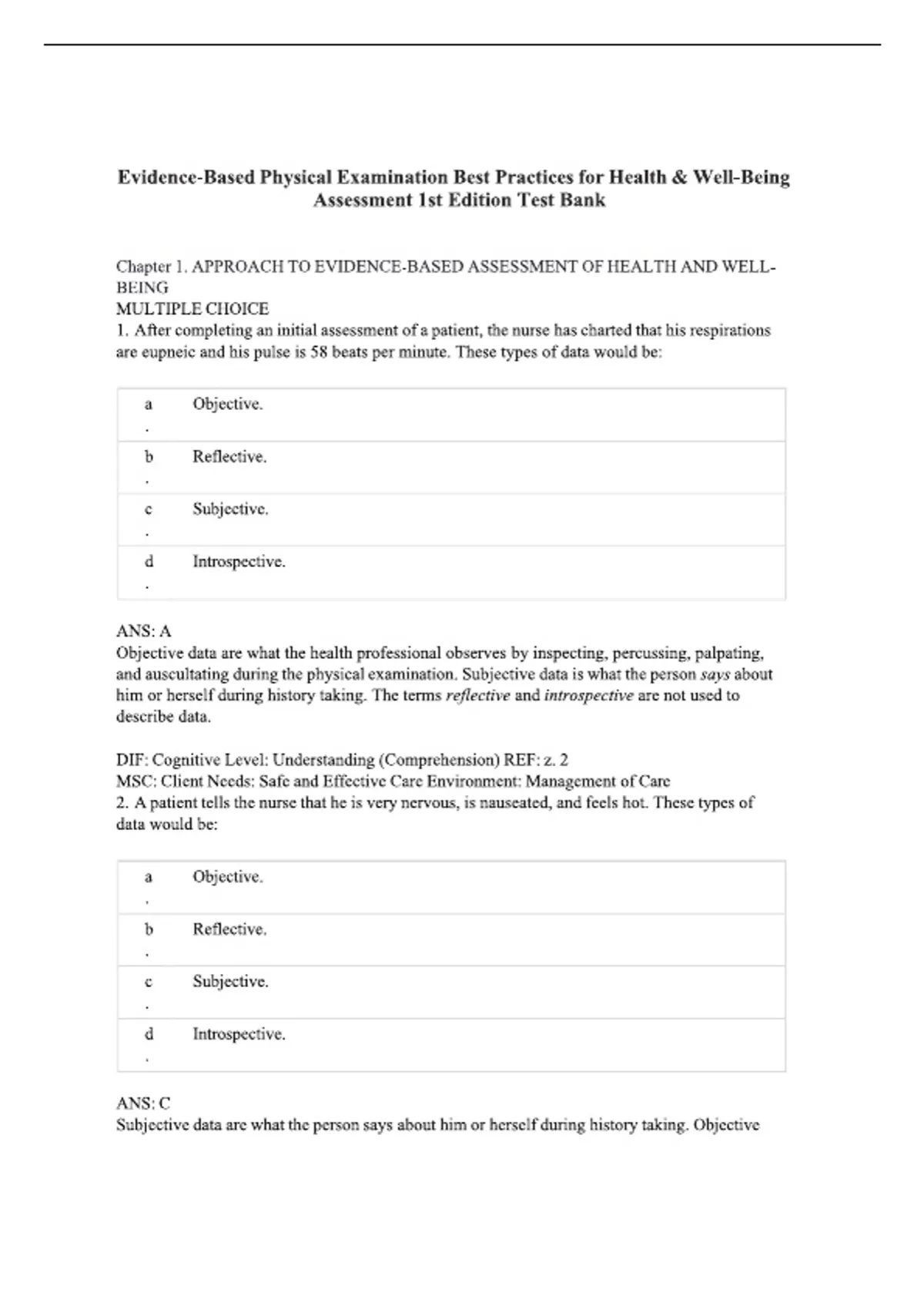 Evidence-Based Physical Examination Best Practices for Health & Well-Being Assessment 1st Edition Test Bank ISBN-10:6 ISBN-13:4537 Table of Contents PART I: FOUNDATIONS OF CLINICAL PRACTICE Chapter 1. APPROACH TO EVIDENCE-BASED ASSESSMENT OF HEALTH AND WELL-BEING Chapter 2. EVIDENCE-BASED HISTORY-TAKING APPROACH FOR WELLNESS EXAMS, EPISODIC VISITS, AND CHRONIC CARE MANAGEMENT Chapter 3. APPROACH TO IMPLEMENTING AND DOCUMENTING PATIENT-CENTERED, CULTURALLY SENSITIVE EVIDENCE-BASED ASSESSMENT Chapter 4. EVIDENCE-BASED ASSESSMENT OF CHILDREN AND ADOLESCENTS Chapter 5. APPROACH TO THE PHYSICAL EXAMINATION: GENERAL SURVEY AND ASSESSMENT OF VITAL SIGNS PART II: EVIDENCE-BASED PHYSICAL EXAMINATION AND ASSESSMENT OF BODY SYSTEMS Chapter 6. EVIDENCE-BASED ASSESSMENT OF THE HEART AND CIRCULATORY SYSTEM Chapter 7. EVIDENCE-BASED ASSESSMENT OF THE LUNGS AND RESPIRATORY SYSTEM Chapter 8. APPROACH TO EVIDENCE-BASED ASSESSMENT OF BODY HABITUS (HEIGHT, WEIGHT, BODY MASS INDEX, NUTRITION) Chapter 9. EVIDENCE-BASED ASSESSMENT OF SKIN, HAIR, AND NAILS Chapter 10. EVIDENCE-BASED ASSESSMENT OF THE LYMPHATIC SYSTEM Chapter 11. EVIDENCE-BASED ASSESSMENT OF THE HEAD AND NECK Chapter 12. EVIDENCE-BASED ASSESSMENT OF THE EYE Chapter 13. EVIDENCE-BASED ASSESSMENT OF THE EARS, NOSE, AND THROAT Chapter 14. EVIDENCE-BASED ASSESSMENT OF THE NERVOUS SYSTEM Chapter 15. EVIDENCE-BASED ASSESSMENT OF THE MUSCULOSKELETAL SYSTEM Chapter 16. EVIDENCE-BASED ASSESSMENT OF THE ABDOMINAL, GASTROINTESTINAL, AND UROLOGICAL SYSTEMS PART III: EVIDENCE-BASED PHYSICAL EXAMINATION AND ASSESSMENT OF SEXUAL AND REPRODUCTIVE HEALTH Chapter 17. EVIDENCE-BASED ASSESSMENT OF THE BREASTS AND AXILLAE Chapter 18. EVIDENCE-BASED ASSESSMENT OF SEXUAL ORIENTATION, GENDER IDENTITY, AND HEALTH Chapter 19. EVIDENCE-BASED ASSESSMENT OF MALE GENITALIA, PROSTATE, RECTUM, AND ANUS Chapter 20. EVIDENCE-BASED ASSESSMENT OF THE FEMALE GENITOURINARY SYSTEM Chapter 21. EVIDENCE-BASED OBSTETRIC ASSESSMENT PART IV: EVIDENCE-BASED PHYSICAL EXAMINATION AND ASSESSMENT OF MENTAL HEALTH Chapter 22. EVIDENCE-BASED ASSESSMENT OF MENTAL HEALTH Chapter 23. EVIDENCE-BASED ASSESSMENT OF SUBSTANCE USE DISORDER Chapter 24. EVIDENCE-BASED ASSESSMENT AND SCREENING FOR TRAUMATIC EXPERIENCES: ABUSE, NEGLECT, AND INTIMATE PARTNER VIOLENCE Chapter 25. EVIDENCE-BASED THERAPEUTIC COMMUNICATION AND MOTIVATIONAL INTERVIEWING IN HEALTH ASSESSMENT PART V: SPECIAL TOPICS IN EVIDENCE-BASED ASSESSMENT Chapter 26. EVIDENCE-BASED HISTORY AND PHYSICAL EXAMINATIONS FOR SPORTS PARTICIPATION EVALUATION Chapter 27. USING HEALTH TECHNOLOGY IN EVIDENCE-BASED ASSESSMENT Chapter 28. EVIDENCE-BASED ASSESSMENT OF PERSONAL HEALTH AND WELL-BEING FOR CLINICIANS: KEY STRATEGIES TO ACHIEVE OPTIMAL WELLNESS Chapter 29. EVIDENCE-BASED HEALTH AND WELL-BEING ASSESSMENT: PUTTING IT ALL TOGETHER