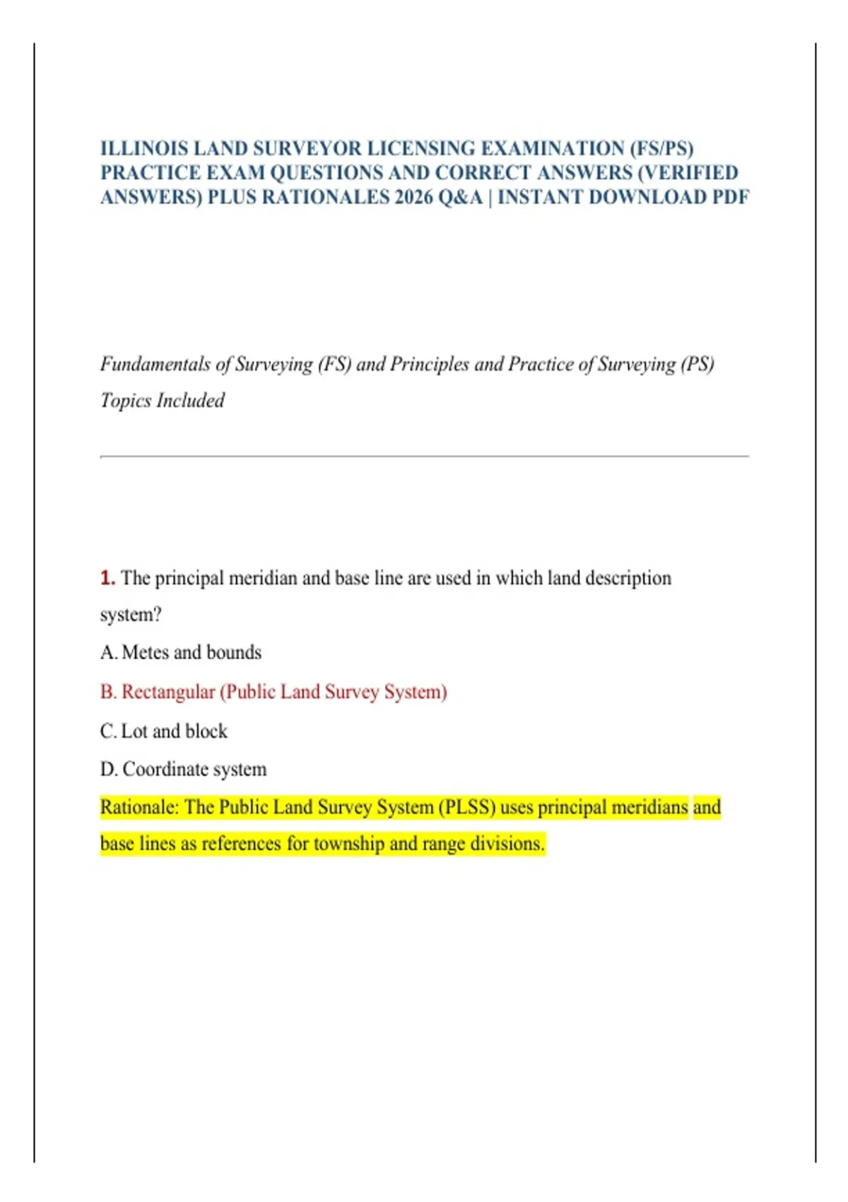 Illinois Land Surveyor Licensing Examination (FSPS) | Practice Exam Verified Questions & Answers