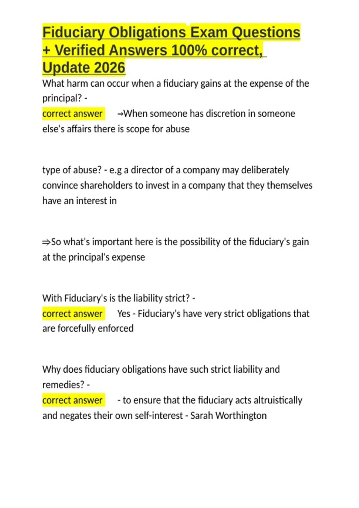 , Fiduciary Obligations Exam Questions