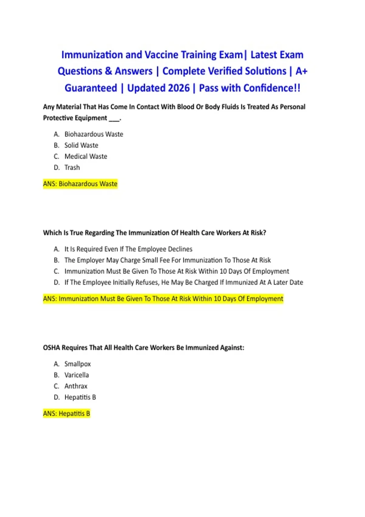 Immunization and Vaccine Training Exam| Latest Exam Questions & Answers | Complete Verified Solutions | A+ Guaranteed | Updated 2026 | Pass with Confidence!!