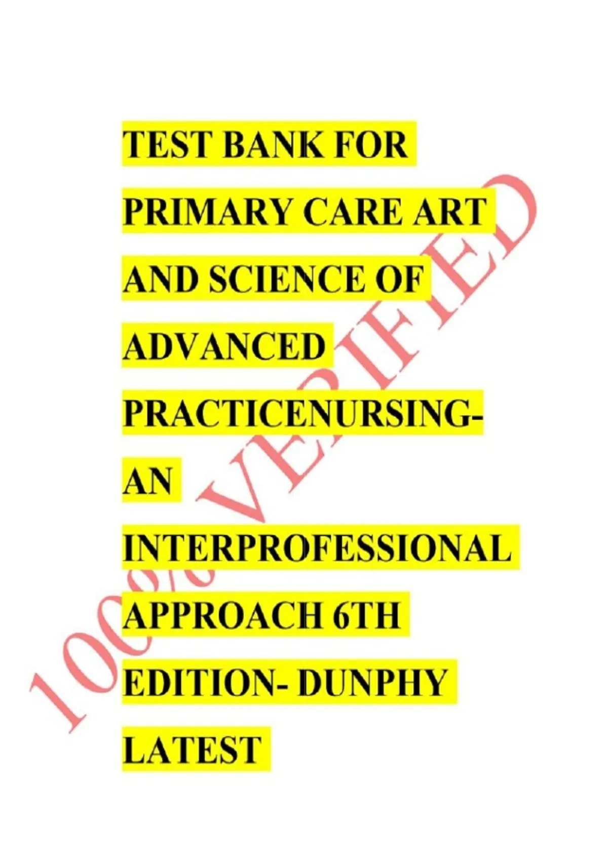 TEST BANK For Primary Care The Art and Science of Advanced Practice · Nursing – an Interprofessional Approach (6th e.) Sixth Edition · by Debera J. Dunphy All Chapters Covered Latest Updated..