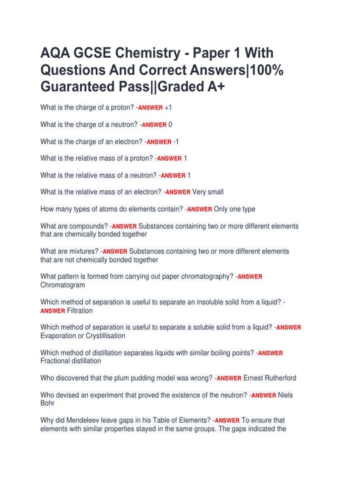 AQA GCSE Chemistry - Paper 1 With Questions And Correct Answers|100% Guaranteed Pass||Graded A+