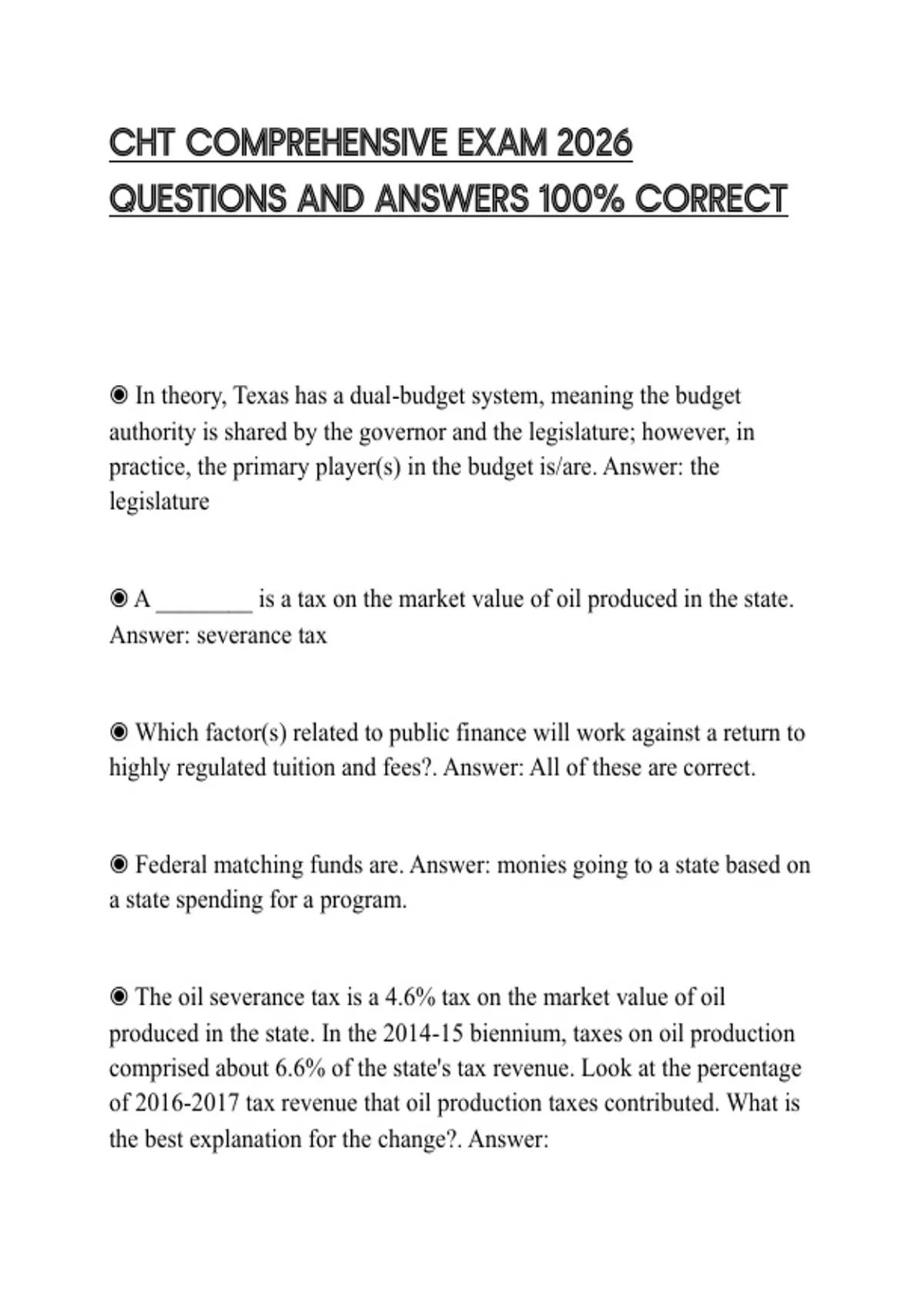 CHT COMPREHENSIVE EXAM 2026 QUESTIONS AND ANSWERS 100% CORRECT