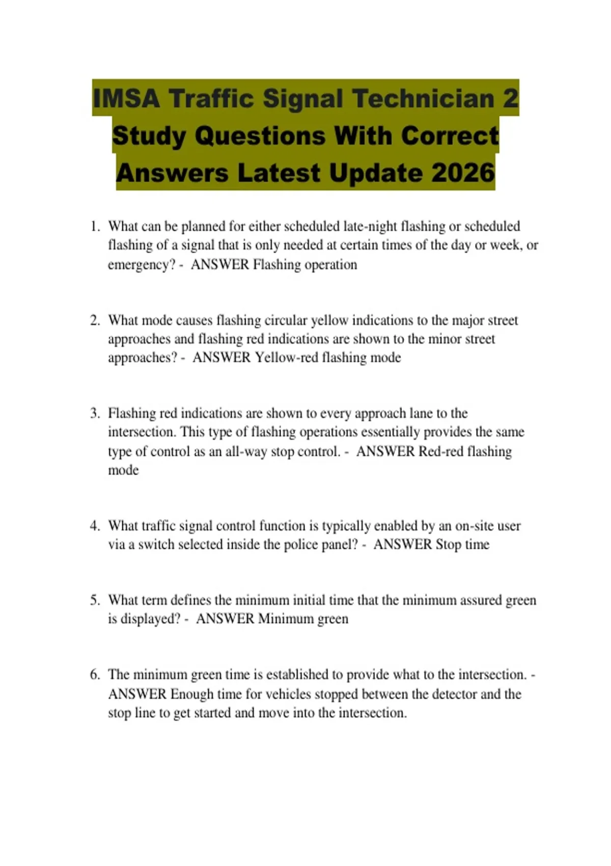 IMSA Traffic Signal Technician 2 Study Questions With Correct Answers Latest Update 2026 1. What can be planned for either scheduled late-night flashing or scheduled flashing of a signal that is only needed at certain times of the day or week, or emergency? - ANSWER Flashing operation 2. What mode causes flashing circular yellow indications to the major street approaches and flashing red indications are shown to the minor street approaches? - ANSWER Yellow-red flashing mode 3. Flashing red indications are shown to every approach lane to the intersection. This type of flashing operations essentially provides the same type of control as an all-way stop control. - ANSWER Red-red flashing mode 4. What traffic signal control function is typically enabled by an on-site user via a switch selected inside the police panel? - ANSWER Stop time 5. What term defines the minimum initial time that the minimum assured green is displayed? - ANSWER Minimum green 6. The minimum green time is established to provide what to the intersection. - ANSWER Enough time for vehicles stopped between the detector and the stop line to get started and move into the intersection. 7. On what two factors is minimum green time dependent? - ANSWER The location of the detector. The number of vehicles that can be queued 8. When establishing the minimum green time consideration must be given to(4): - ANSWER Pedestrian timing Density operations Controller type Detection design 9. When there are no pedestrian features the minimum green time should be calculated by? - ANSWER At least equal the minimum time it would take a pedestrian to safely cross the intersection. 10. Typically how many seconds for a left-turn phase? - ANSWER 3 to 7 11. How many seconds for a minor street through phase? - ANSWER 5 to 15 12. How many seconds for a major street through phase? - ANSWER 15 to 25 13. The minimum green time must be long enough to? - ANSWER Meet drivers expectations as to how long a green interval should be displayed. 14. What is the period of time that the signal displays are red for all approaches? - ANSWER All-red clearance 15. This interval allows for the intersection to "what" before a green phase starts again? - ANSWER Clear 16. Factors used to determine the most appropriate time for an all red clearance include: - ANSWER Type of vehicular traffic Driver characteristics Pedestrian activity in the intersection 17. What is the establishment of a definite timing relationship between adjacent traffic signals? - ANSWER Coordination timing 18. Traffic signal coordination timings are developed to provide a degree of consistency that should allow traffic to? - ANSWER Progress through a number of intersections without stopping 19. What within traffic controllers allow for timing plans to transition from one to another gradually so that traffic is not severely disrupted? - ANSWER Algorithms 20. The amount of time that is allocated to a particular signal phase is the phases? - ANSWER Split 21. A split includes what three things associated with the phase? - ANSWER Green time Yellow time Red time 22. What is the transfer of the normal control of signals to a special signal control mode? - ANSWER Preemption timing 23. Preemption timing has the purpose of servicing? - ANSWER Railroad crossings Emergency vehicle passage Mass transit vehicle passage Other special tasks 24. Preemption timing control requires "what" of normal traffic control to provide the priority needs of a special task? - ANSWER Terminating 25. Transit preemption is often called what? - ANSWER Transit Priority 26. Transit priority can operate by two different techniques: - ANSWER Green extension Red truncation 27. What has the purpose of transferring the right of way to an emergency vehicle that needs to traverse an intersection? - ANSWER Emergency vehicle preemption 28. What are the two types of emergency vehicle preemptions? - ANSWER Stationary Mobile 29. How is stationary emergency vehicle preemption typically activated - ANSWER When an emergency responder depresses a pushbutton located within the facility .